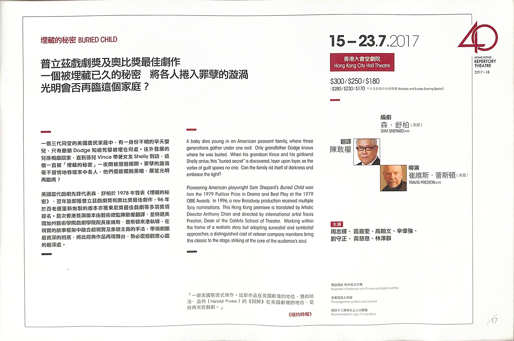 美國當代戲劇先鋒代表森.舒柏於1978年發表《埋藏的秘密》,翌年旋即獲普立茲戲劇獎和奧比獎最佳劇作,96年於百老匯重新炮製的版本亦獲東尼獎最佳戲劇等多項獎項提名。是次香港首演版本由藝術總監陳敢權翻譯,並特邀美國加州藝術學院戲劇學院院長崔維斯.普斯頓來港執導,在現實的故事框架中融合超現實及象徵主義的手法,帶領劇團最資深的班底,將此經典作品再現舞台,勢必震撼觀眾心靈的最深處。