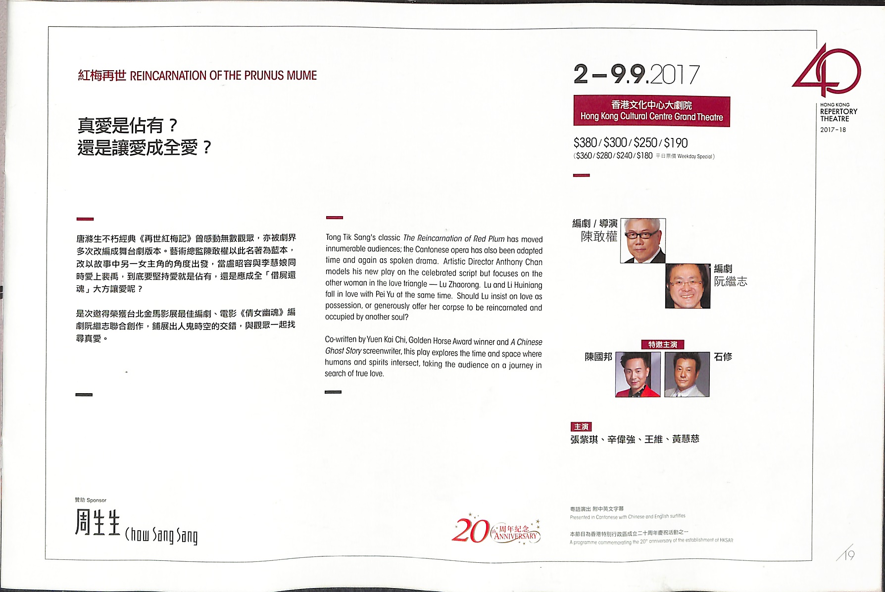 真愛是佔有? 還是讓愛成全愛? 唐滌生不朽經典《再世紅梅記》曾感動無數觀眾,亦被劇界多次改編成舞台劇版本。藝術總監陳敢權以此名著為藍本,改以故事中另一女主角的角度出發,當盧昭容與李慧娘同時愛上裴禹,到底要堅持愛就是佔有,還是應成全「借屍還魂」大方讓愛呢? 是次邀得榮獲台北金馬影展最佳編劇、電影《倩女幽魂》編劇阮繼志聯合創作,鋪展出人鬼時空的交錯,與觀眾一起找尋真愛。