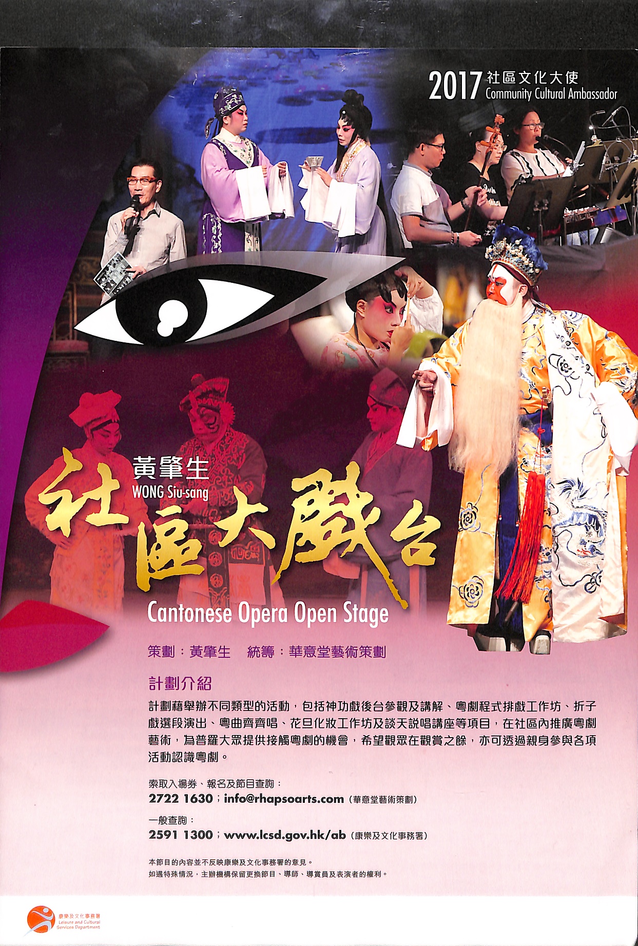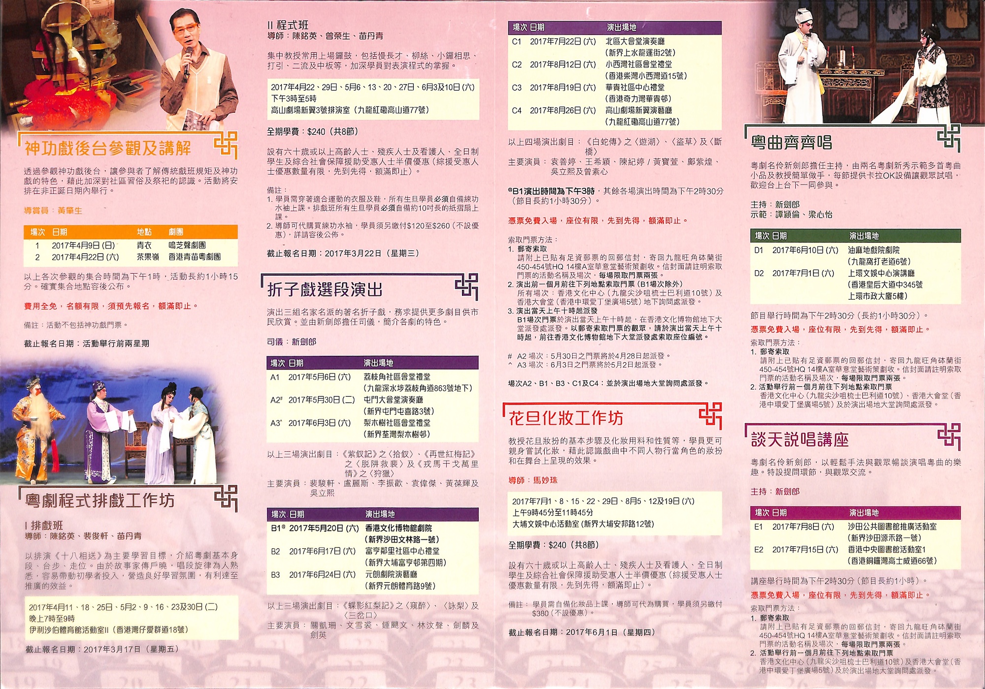 計劃藉舉辦不同類型的活動,包括粵劇程式排戲工作坊、神功戲後台參觀及講解、粵曲齊齊唱、花旦化妝工作坊、折子戲選段演出及談天說唱講座等項目,在社區內推廣粵劇藝術,為普羅大眾提供接觸粵劇的機會,希望觀眾在觀賞之餘,亦可透過親身參與各項活動認識粵劇。以上四場演出劇目:《白蛇傳》之〈遊湖〉、〈盗草〉及〈斷橋〉