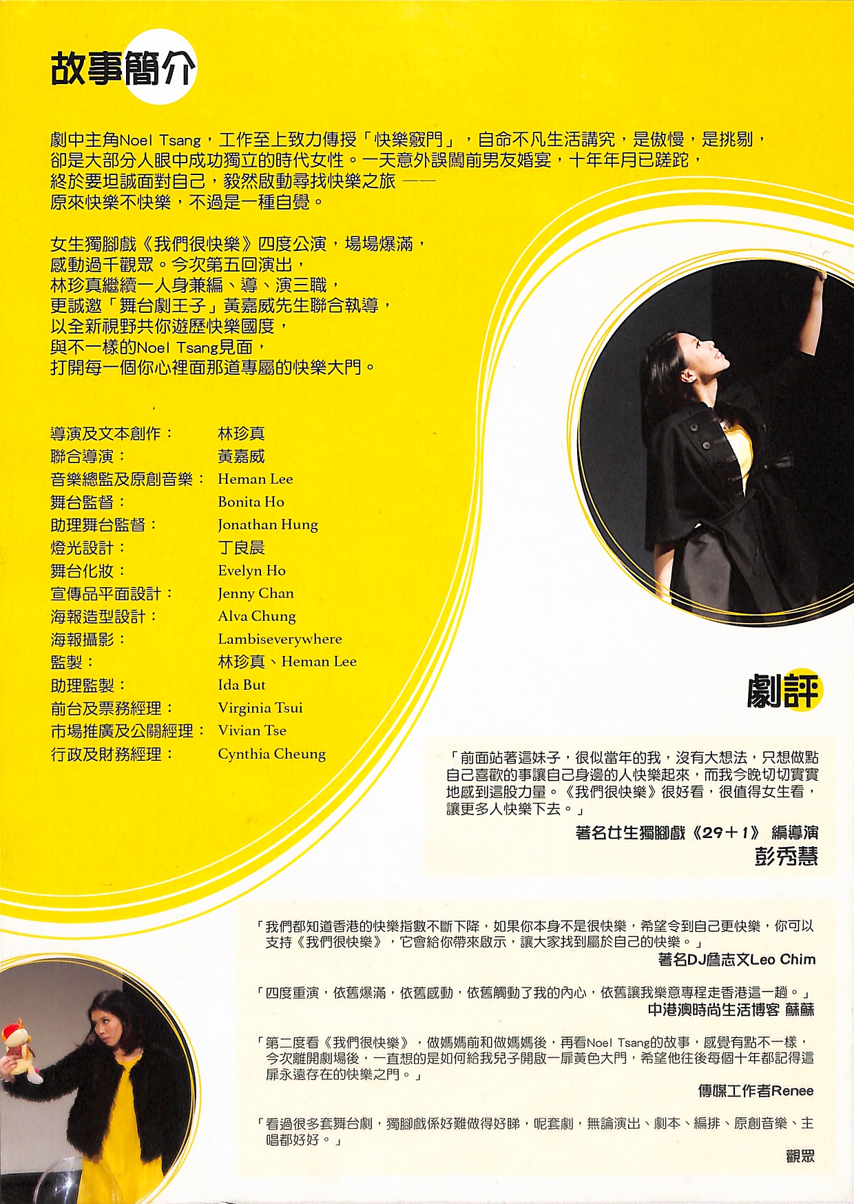 第五回演出,林珍真繼續一人身兼編、導、演三職,更誠邀「舞台劇王子」黃嘉威先生聯合執導,以全新視野共你遊歷快樂國度,與不一樣的Noel Tsang見面,打開每一道專屬的快樂大門。劇中主角Noel Tsang,工作至上致力傳授「快樂竅門」,自命不凡生活講究,是傲慢是挑剔卻是大部分人眼中成功獨立的時代女性。一天意外誤闖前男友婚宴,十年年月已蹉跎,終於要坦誠面對自己,毅然啟動尋找快樂之旅 —— 原來快樂不快樂,不過是一種自覺。