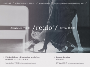 《re: do / Joseph Lee / KT Yau》分別集合了兩位年輕編舞的作品,李偉能(JosephLee) 及邱加希(KT Yau) 在2016年發表的的獨舞作品《回聲摺疊》和《睇我唔到》作為是次重演的主軸。