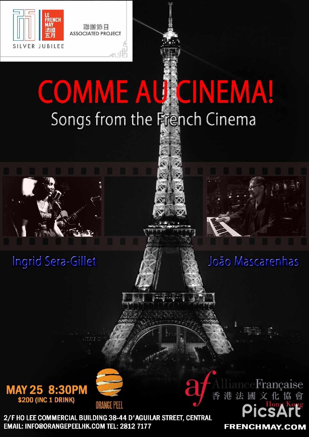 法國歌手Ingrid Sera-Gillet和巴西製作人及鋼琴家Joao Marcos Mascarenhas將獻上法國電影的歌曲和場面,使人沉醉於難忘的法國電影夜。欣賞法國電影歌曲!復甦法國電影和音樂的導演和作曲家:François Truffaut (Nouvelle Vague – 法國新浪潮),凱撒獎 – 法國奧斯卡獲獎者Georges Delerue,Jacques Demy (創作著名音樂劇) ,超脫的Jean-Luc Godard,奧斯卡獲獎者Michel Legrand,法國電影領導者Luc Besson 和Éric Serra 等與你渡過法國電影音樂的漩渦中。