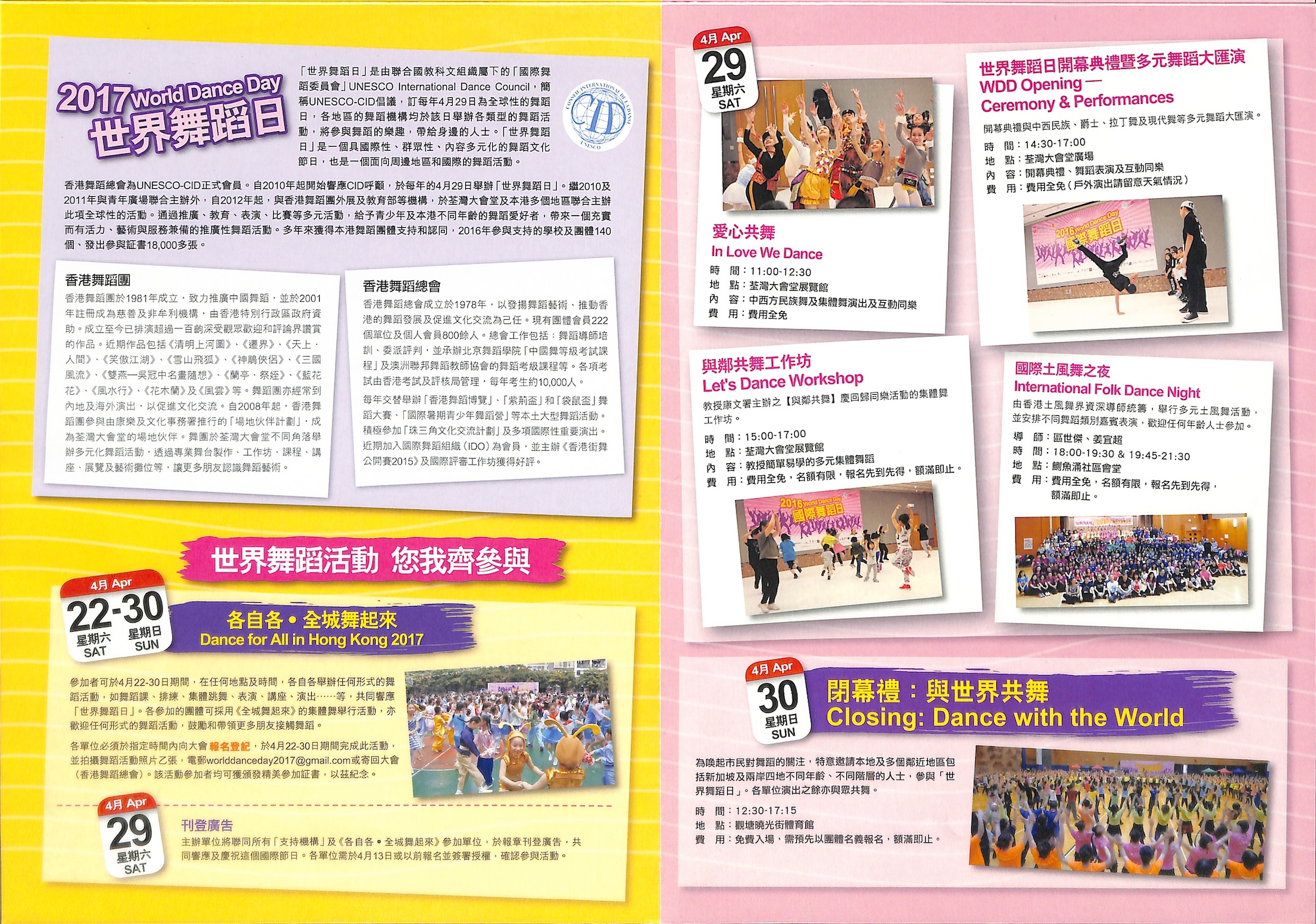 內容:為喚起市民對舞蹈的關注,特意邀請本地及多個鄰近地區包括新加坡及兩岸四地不同年齡、不同階層的人士,參與【世界舞蹈日】。各單位演出之餘亦與眾共舞。