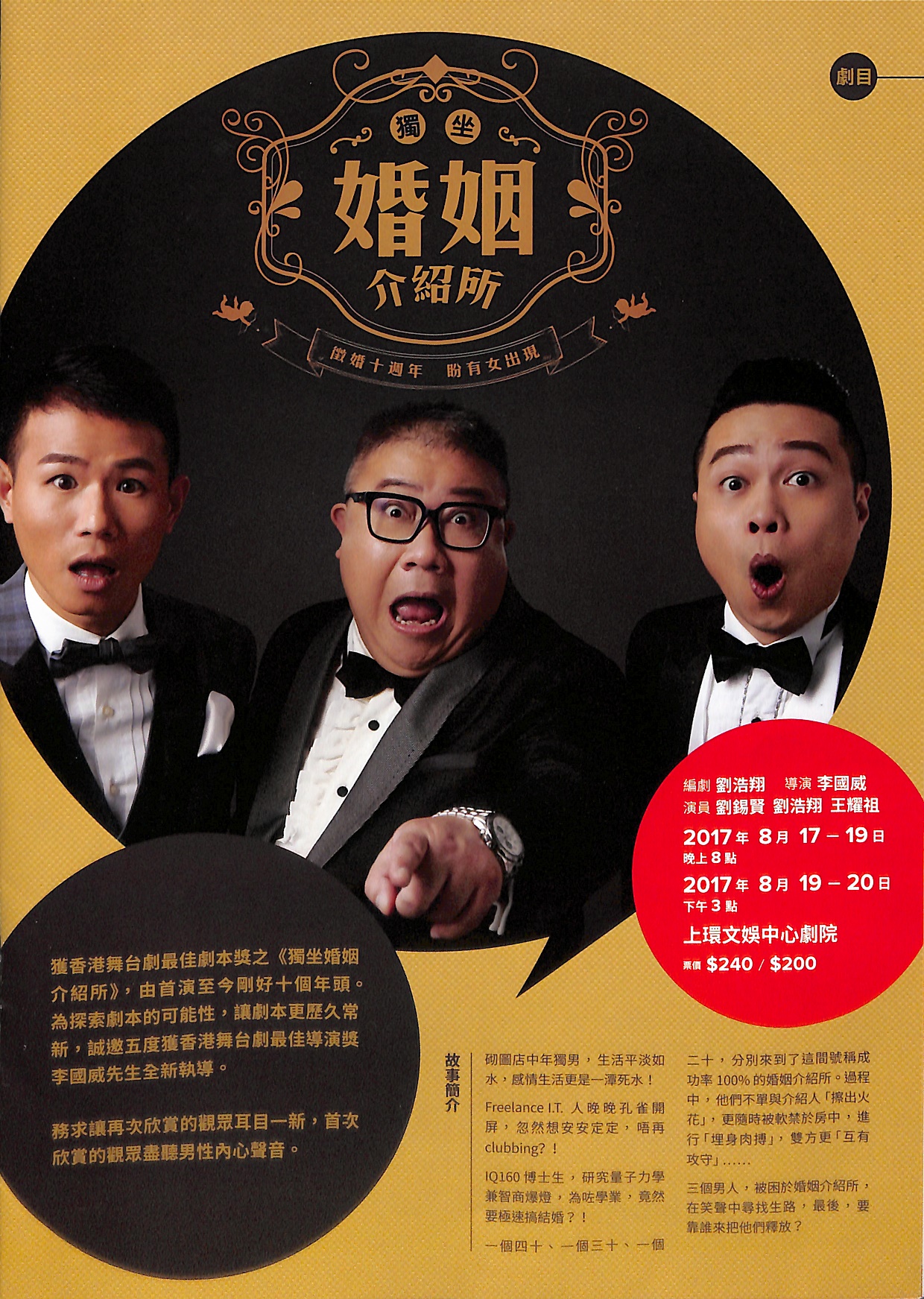 獲香港舞台劇最佳劇本獎之《獨坐婚姻介紹所》,由首演至今剛好十個年頭。為探索劇本的可能性,讓劇本更歷久常新,誠邀五度獲香港舞台劇最佳導演獎李國威先生全新執導。