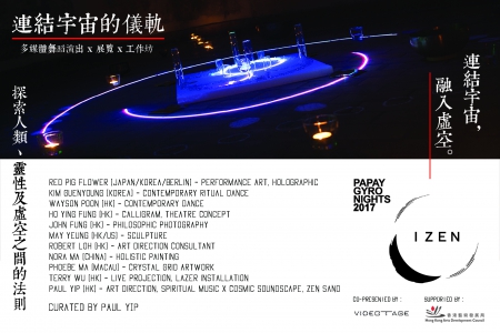 由 Red Pig Flower(駐柏林日韓藝術家/DJ Producer)X 金槿映(韓國辛恩珠舞蹈團員)X 盤偉信 (當代編舞及舞者)X 何應豐(著名劇場導演)X 馮建中John Fung(國際著名攝影師)X 陸叔遠(香港金像獎最佳美術指導)X 青雨 Nora (全球娜拉計劃創辦人)X 釗鳴 (錄像藝術家,易辰創辦人)X 葉破(策展,藝術及音樂總監)聯手創作,建構一個簡約唯美,真實卻抽象的場景,配以流動影像、靈音聲頻、當下哲理照片、靈性畫作、水晶鐳射裝置及傳統儀式當代舞蹈,讓各種藝術原素互相牽引,並推展至極致,將觀眾由現實帶到抽象的時間及空間概念,最後回歸每個靈魂獨特的靈性。