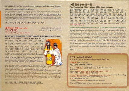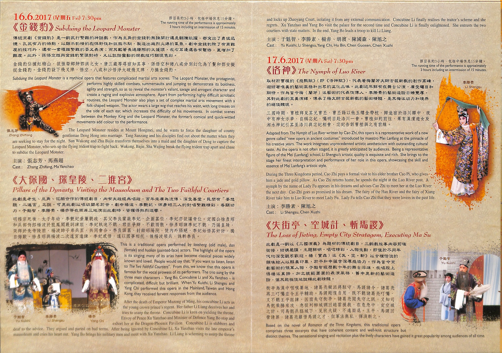當今京劇界兩大院團攜手來港獻技,星光熠熠,以重量級演出陣容為中國戲曲節揭開序幕。首先由北京京劇院登場,演出三場劇目,開幕演出選演熱鬧豐富的傳統大戲《龍鳳呈祥》,集合鼎盛陣容,由著名京劇表演藝術家于魁智、杜鎮杰、楊少彭分飾劉備,李勝素、張慧芳分飾孫尚香,再加上著名小生李宏圖及其他名角等坐陣。《群英會、借東風、華容道》亦為經典老戲,唱腔繞樑,著名譚(鑫培)派老生譚孝曾與馬(連良)派老生朱強,以及楊(寶森)派老生杜鎮杰和特邀的袁世海親傳弟子楊赤聯袂演出。《四郎探母》是著名張(君秋)派大青衣王蓉蓉代表作之一,這次夥拍分飾楊延輝的老生張建峰、譚正岩、楊少彭及朱強演出,同場欣賞奚(嘯伯)派、譚(鑫培)派、楊(寶森)派和馬(連良)派藝術,是別開生面的嘗試。中國國家京劇院一團緊接演出三場經典劇目,頭牌老生于魁智為現時京劇界首屈一指的藝術家,領銜旦角李勝素深得梅(蘭芳)派藝術真傳,與楊赤合演《大保國、探皇陵、二進宮》,唱段極其繁重,盡顯演員的默契和功力。《洛神》和《太真外傳》均為著名梅派作品,《失街亭、空城計、斬馬謖》則為京劇老生演員展示功架的代表作。