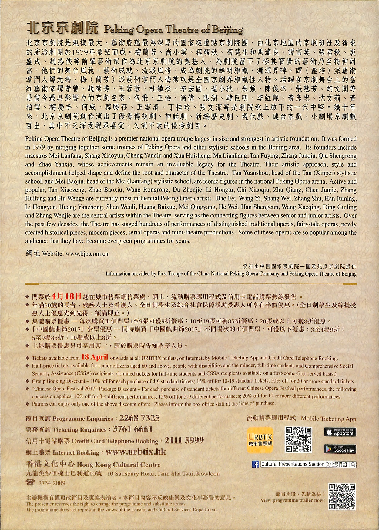 當今京劇界兩大院團攜手來港獻技,星光熠熠,以重量級演出陣容為中國戲曲節揭開序幕。首先由北京京劇院登場,演出三場劇目,開幕演出選演熱鬧豐富的傳統大戲《龍鳳呈祥》,集合鼎盛陣容,由著名京劇表演藝術家于魁智、杜鎮杰、楊少彭分飾劉備,李勝素、張慧芳分飾孫尚香,再加上著名小生李宏圖及其他名角等坐陣。《群英會、借東風、華容道》亦為經典老戲,唱腔繞樑,著名譚(鑫培)派老生譚孝曾與馬(連良)派老生朱強,以及楊(寶森)派老生杜鎮杰和特邀的袁世海親傳弟子楊赤聯袂演出。《四郎探母》是著名張(君秋)派大青衣王蓉蓉代表作之一,這次夥拍分飾楊延輝的老生張建峰、譚正岩、楊少彭及朱強演出,同場欣賞奚(嘯伯)派、譚(鑫培)派、楊(寶森)派和馬(連良)派藝術,是別開生面的嘗試。中國國家京劇院一團緊接演出三場經典劇目,頭牌老生于魁智為現時京劇界首屈一指的藝術家,領銜旦角李勝素深得梅(蘭芳)派藝術真傳,與楊赤合演《大保國、探皇陵、二進宮》,唱段極其繁重,盡顯演員的默契和功力。《洛神》和《太真外傳》均為著名梅派作品,《失街亭、空城計、斬馬謖》則為京劇老生演員展示功架的代表作。