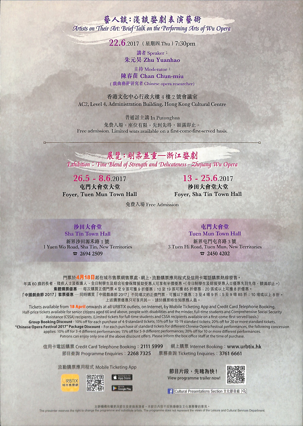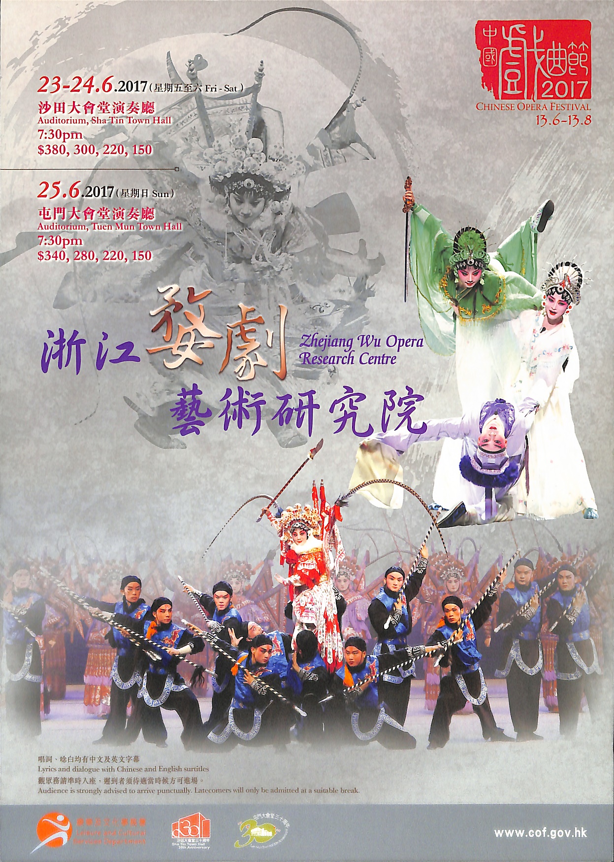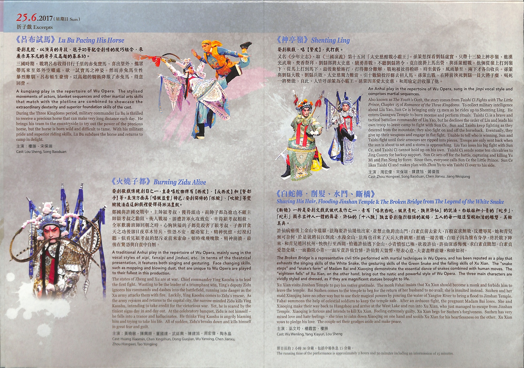 婺劇為浙江省主要地方戲曲劇種之一,流行於金華及附近一帶地區,俗稱金華戲,是集高腔、崑腔、亂彈、徽戲、灘簧、時調六種聲腔的合班。其各種行當武功出色,能文能武,剛柔並重,故往往文戲武做,武戲文唱,藝術風格鮮明生動及強烈粗獷,擅長演繹舞蹈及武打場面,突顯動作力量和強烈情感。浙江婺劇藝術研究院於2013年曾來港參與戲曲節演出,精彩表現令觀眾拍案叫絕。今次載譽來港,優秀婺劇表演藝術家楊霞雲、樓勝、巫文玲等將演出經典婺劇劇目︰大戲《穆桂英》場面盛大、武打技巧高超;多齣折子戲運用婺劇傳統技巧及武打身段演出,如《三打王英》中的「倒喝水」;《火燒子都》中的「抹臉」、「吹臉」等變臉絕技;文戲武做的代表作之一《白蛇傳‧斷橋》內白蛇和青蛇的「蛇步」,加上許仙的「十八跌」等,定必令觀眾看得熱血沸騰。