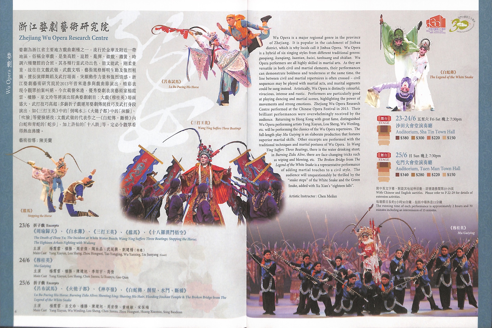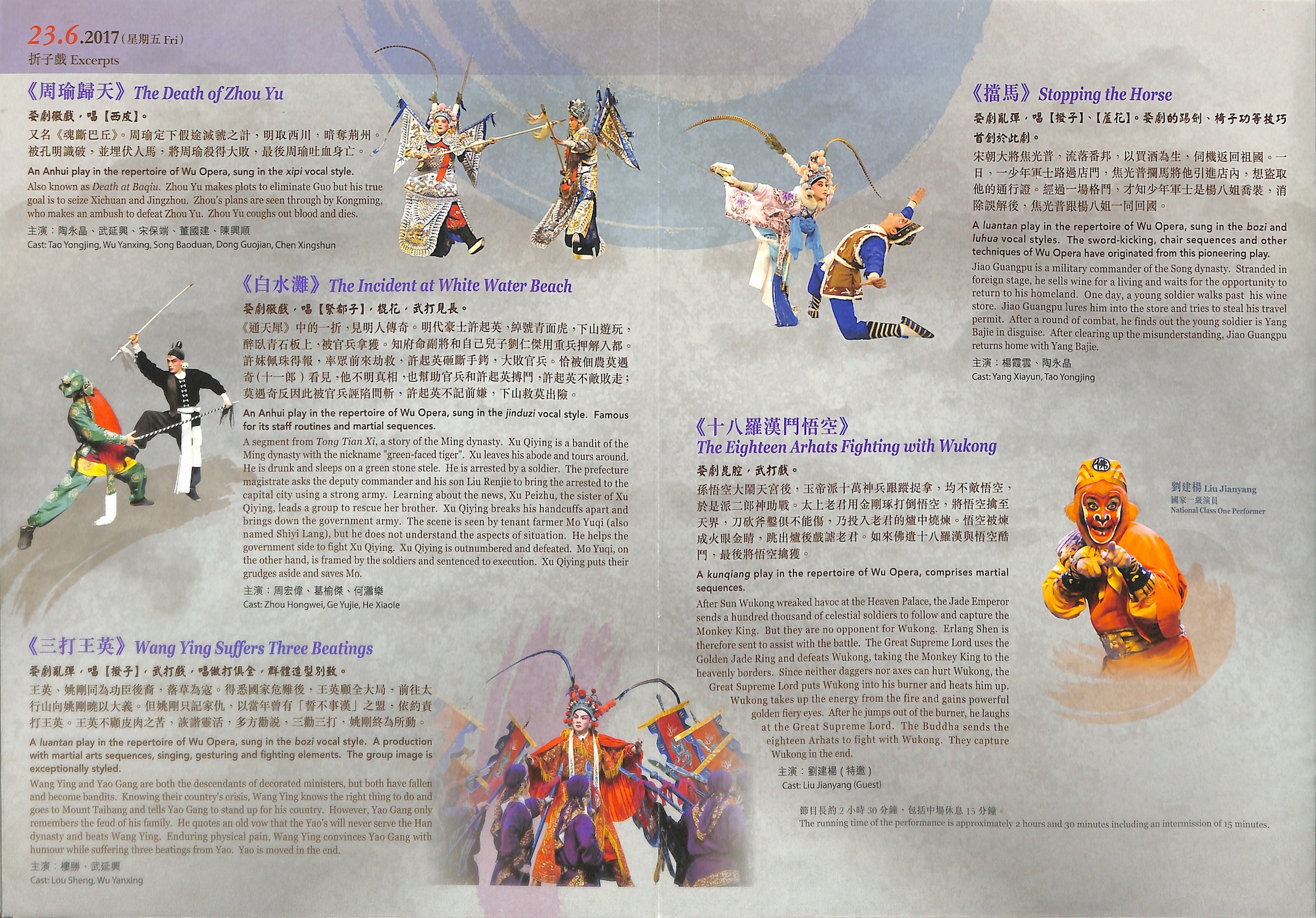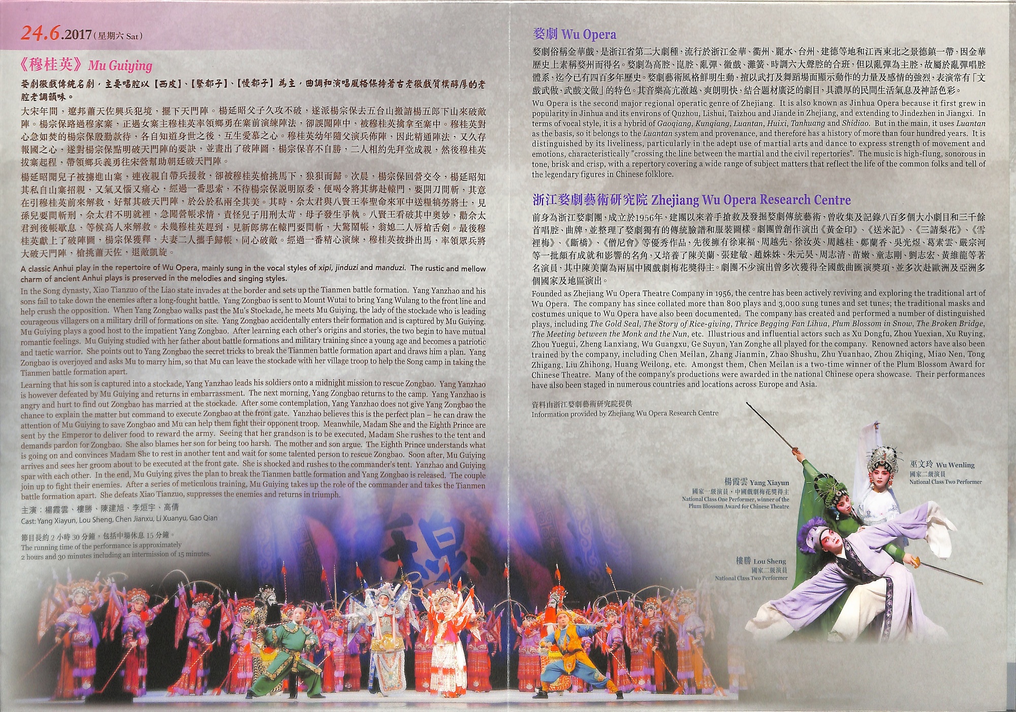 婺劇為浙江省主要地方戲曲劇種之一,流行於金華及附近一帶地區,俗稱金華戲,是集高腔、崑腔、亂彈、徽戲、灘簧、時調六種聲腔的合班。其各種行當武功出色,能文能武,剛柔並重,故往往文戲武做,武戲文唱,藝術風格鮮明生動及強烈粗獷,擅長演繹舞蹈及武打場面,突顯動作力量和強烈情感。浙江婺劇藝術研究院於2013年曾來港參與戲曲節演出,精彩表現令觀眾拍案叫絕。今次載譽來港,優秀婺劇表演藝術家楊霞雲、樓勝、巫文玲等將演出經典婺劇劇目︰大戲《穆桂英》場面盛大、武打技巧高超;多齣折子戲運用婺劇傳統技巧及武打身段演出,如《三打王英》中的「倒喝水」;《火燒子都》中的「抹臉」、「吹臉」等變臉絕技;文戲武做的代表作之一《白蛇傳‧斷橋》內白蛇和青蛇的「蛇步」,加上許仙的「十八跌」等,定必令觀眾看得熱血沸騰。