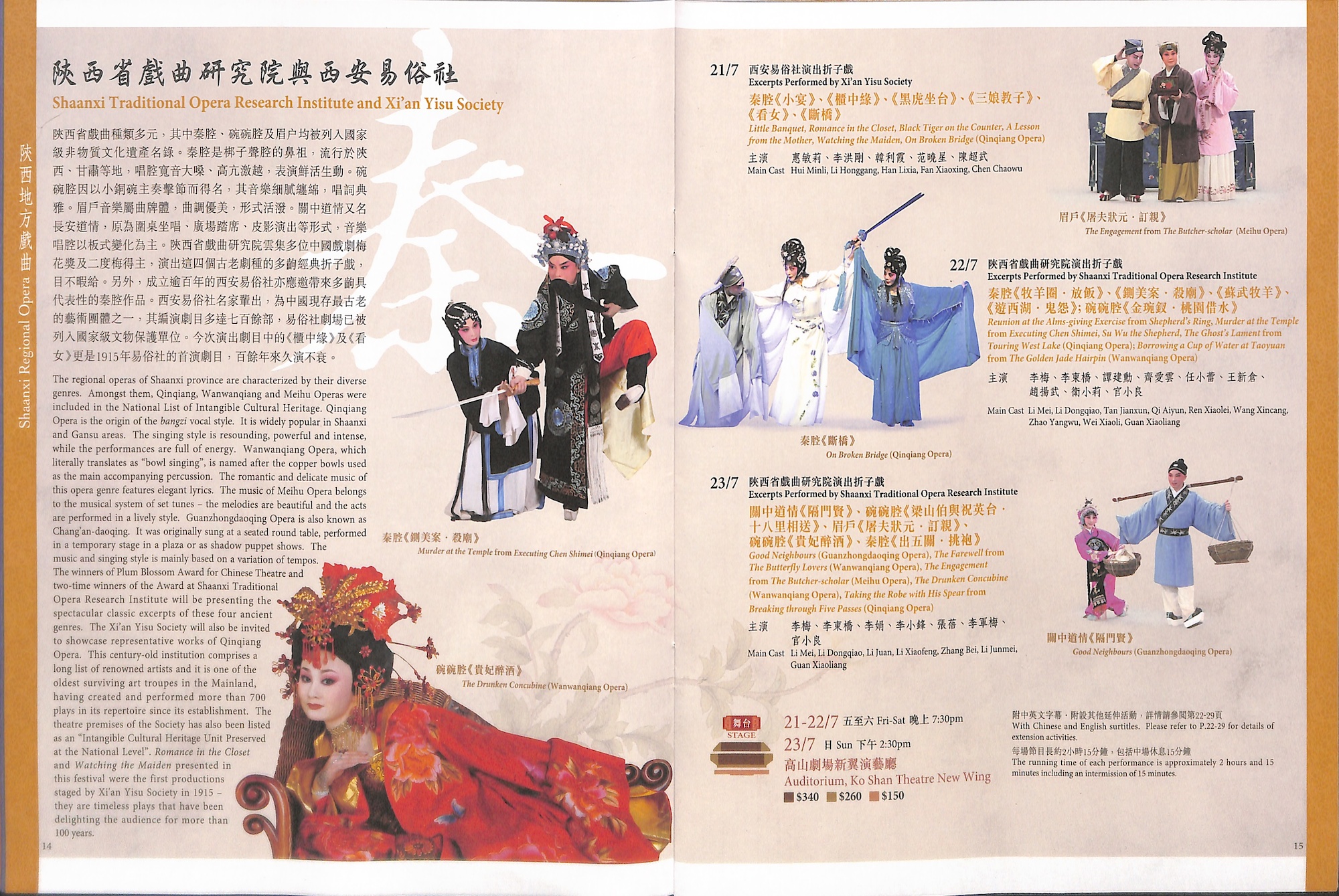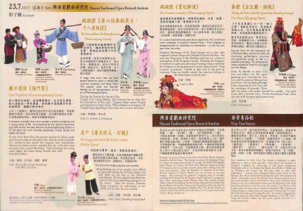 陝西省戲曲種類多元,其中秦腔、碗碗腔及眉戶均被列入國家級非物質文化遺產名錄。秦腔是梆子聲腔的鼻祖,流行於陝西、甘肅等地,唱腔寬音大嗓、高亢激越,表演鮮活生動。碗碗腔因以小銅碗主奏擊節而得名,其音樂細膩纏綿,唱詞典雅。眉戶音樂屬曲牌體,曲調優美,形式活潑。關中道情又名長安道情,原為圍桌坐唱、廣場踏席、皮影演出等形式,音樂唱腔以板式變化為主。陝西省戲曲研究院雲集多位中國戲劇梅花獎及二度梅得主,演出這四個古老劇種的多齣經典折子戲,目不暇給。另外,成立逾百年的西安易俗社亦應邀帶來多齣具代表性的秦腔作品。西安易俗社名家輩出,為中國現存最古老的藝術團體之一,其編演劇目多達七百餘部,易俗社劇場已被列入國家級文物保護單位。今次演出劇目中的《櫃中緣》及《看女》更是1915年易俗社的首演劇目,百餘年來久演不衰。