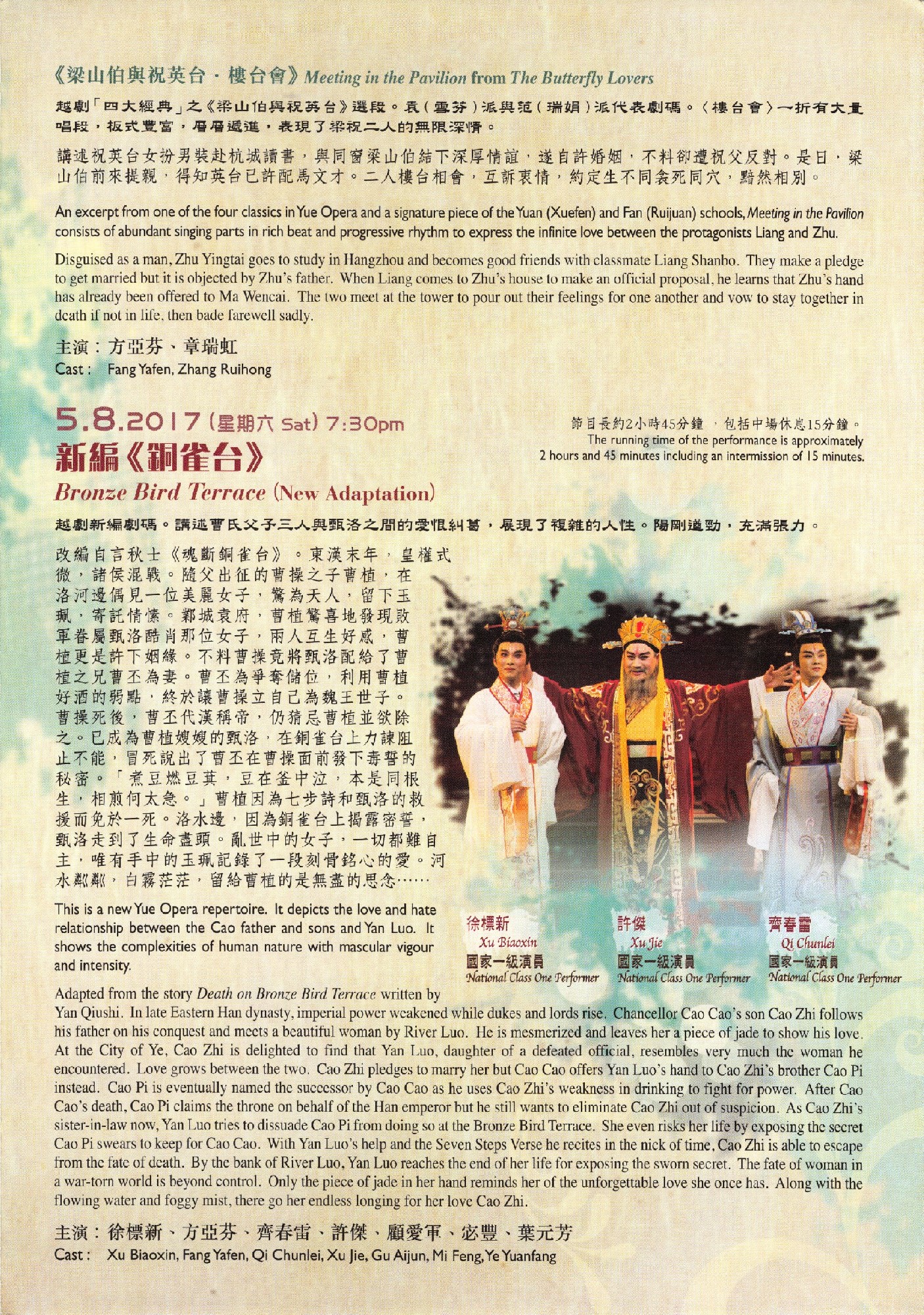 越劇擅於演繹抒情劇作,以唱為主,曲調婉轉柔美,聲音優美動聽,唯美典雅。上海越劇院一團為觀眾帶來越劇鎮山之寶《紅樓夢》,以賈寶玉和林黛玉的愛情悲劇爲中心,同時展現出一個封建大家庭的興衰榮枯。此劇首演以來歷久不衰,一度成為越劇的代名詞。《雙珠鳳》爲陸(錦花)派經典劇目,故事講述明代洛陽解元文必正邂逅美貌的吏部天官霍天榮之獨生女霍定金,兩人一見鍾情後發生的曲折愛情故事,新版保留經典唱段及情節但重新編寫了劇本,更見精彩。新編《銅雀台》由上海越劇院前院長、一級編劇李莉與編劇黃嬿合作改編,述說甄洛與曹植的故事,此劇於2014年在國內首演,將首次登上香港舞台。三齣長劇均由袁(雪芬)派著名花旦、中國戲劇梅花獎得主兼上海越劇院一團團長方亞芬掛頭牌,聯同國家一級演員陸(錦花)派小生徐標新及尹(桂芳)派小生齊春雷演出。折子戲專場更特邀資深演員中國戲劇梅花獎得主王(文娟)派花旦單仰萍、范(瑞娟)派小生章瑞虹參與演出。