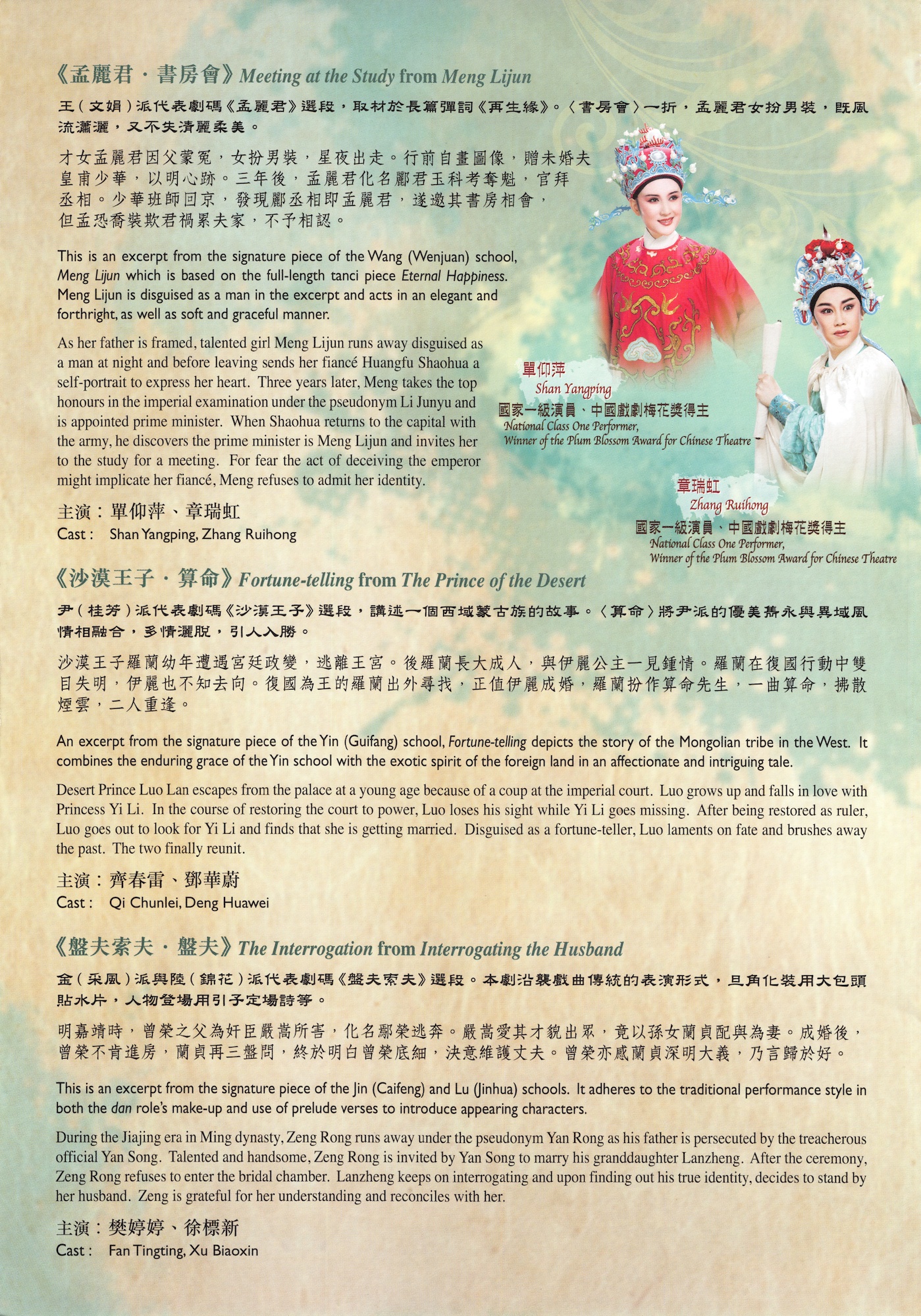 越劇擅於演繹抒情劇作,以唱為主,曲調婉轉柔美,聲音優美動聽,唯美典雅。上海越劇院一團為觀眾帶來越劇鎮山之寶《紅樓夢》,以賈寶玉和林黛玉的愛情悲劇爲中心,同時展現出一個封建大家庭的興衰榮枯。此劇首演以來歷久不衰,一度成為越劇的代名詞。《雙珠鳳》爲陸(錦花)派經典劇目,故事講述明代洛陽解元文必正邂逅美貌的吏部天官霍天榮之獨生女霍定金,兩人一見鍾情後發生的曲折愛情故事,新版保留經典唱段及情節但重新編寫了劇本,更見精彩。新編《銅雀台》由上海越劇院前院長、一級編劇李莉與編劇黃嬿合作改編,述說甄洛與曹植的故事,此劇於2014年在國內首演,將首次登上香港舞台。三齣長劇均由袁(雪芬)派著名花旦、中國戲劇梅花獎得主兼上海越劇院一團團長方亞芬掛頭牌,聯同國家一級演員陸(錦花)派小生徐標新及尹(桂芳)派小生齊春雷演出。折子戲專場更特邀資深演員中國戲劇梅花獎得主王(文娟)派花旦單仰萍、范(瑞娟)派小生章瑞虹參與演出。