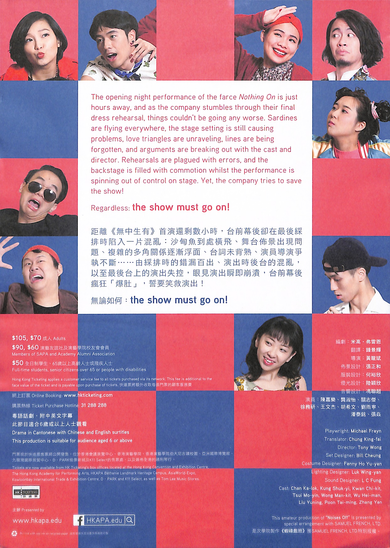 「可能是歷來最令人捧腹大笑的鬧劇經典⋯⋯」——《獨立報》距離《無中生有》首演還剩數小時,台前幕後卻在最後綵排時陷入一片混亂: 沙甸魚到處橫飛、舞台佈景出現問題、 複雜的多角關係逐漸浮面、台詞未背熟、演員導演爭執不斷 …… 由綵排時的錯漏百出、演出時後台的混亂、以至最後台上的演出失控,眼見演出瞬即崩潰,台前幕後瘋狂「爆肚」誓要笑救演出 !無論如何: The show must go on!
