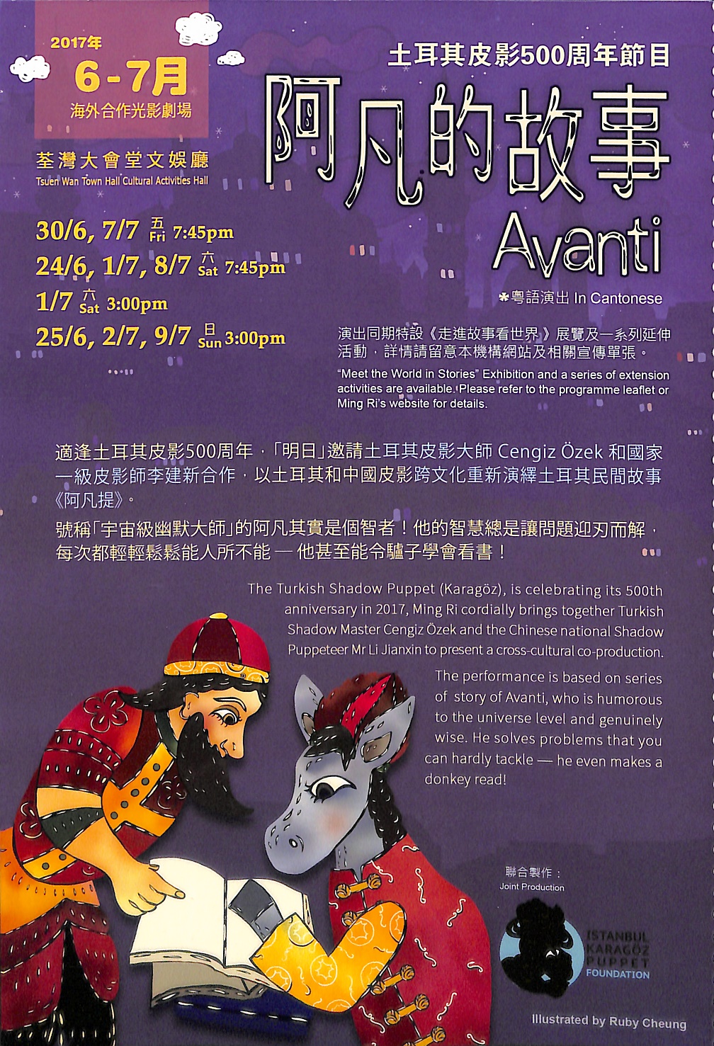適逢土耳其皮影500周年,「明日」邀請土耳其皮影大師Cengiz Ozek和國家一級皮影師李建新合作,以土耳其和中國皮影跨文化重新演繹土耳其民間故事《阿凡提》。號稱「宇宙級幽默大師」的阿凡其實是個智者!他的智慧總是讓問題迎刃而解,每次都輕輕鬆鬆能人所不能──他甚至能令驢子學會看書!