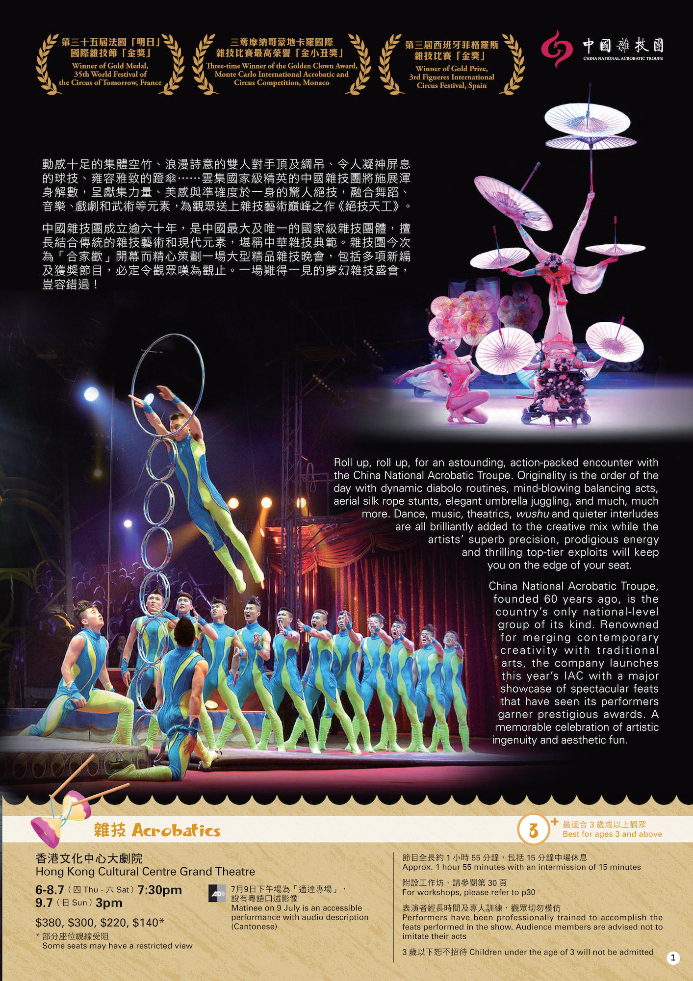 中國雜技團成立逾六十年,是中國最大及唯一的國家級雜技團體,擅長結合傳統的雜技藝術和現代元素,堪稱中華雜技典範。雜技團今次為「合家歡」開幕而精心策劃一場大型精品雜技晚會,包括多項新編及獲獎節目,必定令觀眾嘆為觀止。一場難得一見的夢幻雜技盛會,豈容錯過!