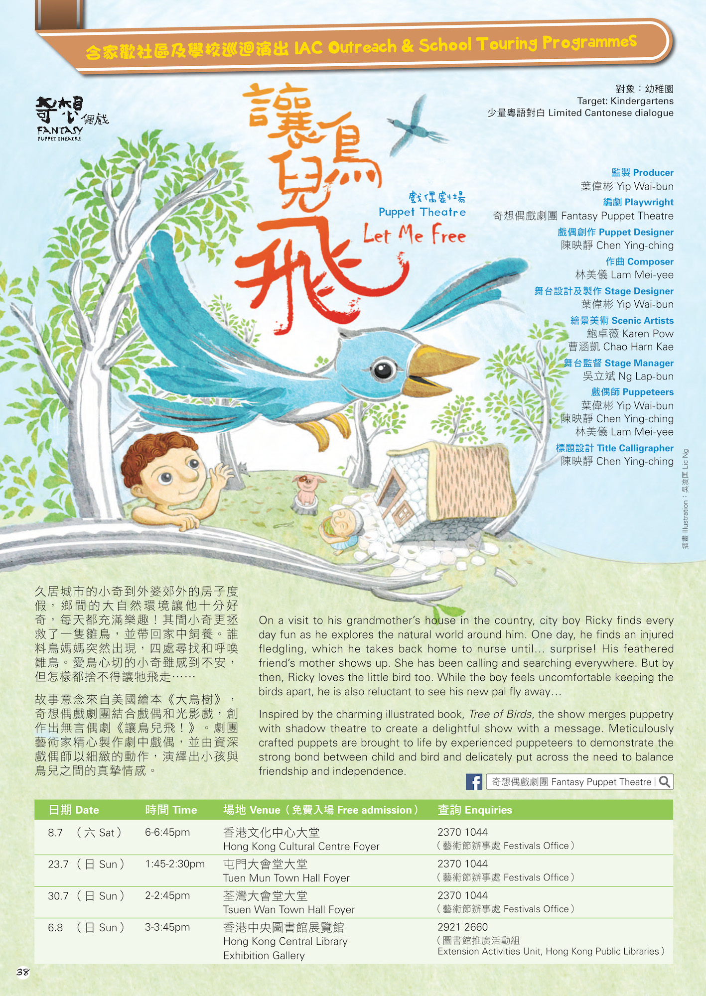 久居城市的小奇到外婆郊外的房子度假,鄉間的大自然環境讓他十分好奇,每天都充滿樂趣!其間小奇更拯救了一隻雛鳥,並帶回家中飼養。誰料鳥媽媽突然出現,四處尋找和呼喚雛鳥。愛鳥心切的小奇雖感到不安,但怎樣都捨不得讓牠飛走‧‧‧‧‧‧故事意念來自美國繪本《大鳥樹》,奇想偶戲劇團結合戲偶和光影戲,創作出無言偶劇《讓鳥兒飛!》。劇團藝術家精心製作劇中戲偶,並由資深戲偶師以細緻的動作,演繹出小孩與鳥兒之間的真摯情感。