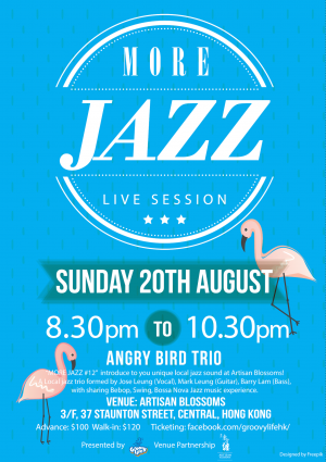 “MORE JAZZ #12” introduce to you unique local jazz sound at Artisan Blossoms 東方纏! A Local jazz trio formed by Jose Leung (Vocal), Mark Leung (Guitar), Barry Lam (Bass), with sharing Bebop, Swing, Bossa Nova Jazz music experience.