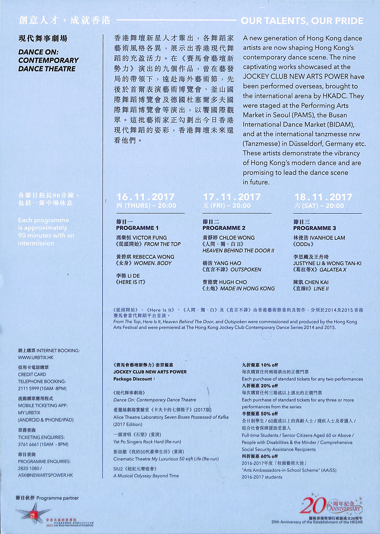 香港舞壇新星人才輩出,各舞蹈家藝術風格各異,展示出香港現代舞蹈的充盈活力。在《賽馬會藝壇新勢力》演出的九個作品,曾在藝發局的帶領下,遠赴海外藝術節,包括馮樂恒《從頭開始》、黃碧琪《女身》、 李思颺及王丹琦《葛拉蒂 X》、李德《Here Is It》、黃靜婷《人間 · 獨 · 白》、楊浩《直言不諱》、曹德寶《土炮》、林俊浩《ODDs》及陳凱《直線 II》,先後於首爾表演藝術博覽會、釜山國際舞蹈博覽會及德國杜塞爾多夫國際舞蹈博覽會演出,以饗國際觀眾。