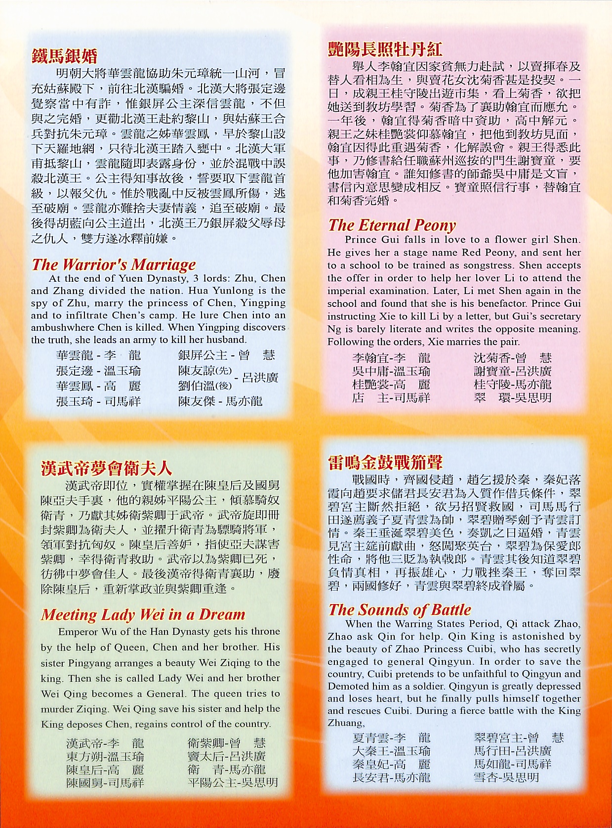 漢武帝即位,實權掌握在陳皇后及國舅陳亞夫手裏,他的親姊平陽公主,傾慕騎奴衛青,乃獻其姊衛紫卿于武帝。武帝旋即冊封紫卿為衛夫人,並擢升衛青為驃騎將軍,領軍對抗匈奴。陳皇后善妒,指使亞夫謀害紫卿,幸得衛青救助。武帝以為紫卿已死,彷彿中夢會佳人。最後漢帝得衛青襄助,廢除陳皇后,重新掌政並與紫卿重逢。