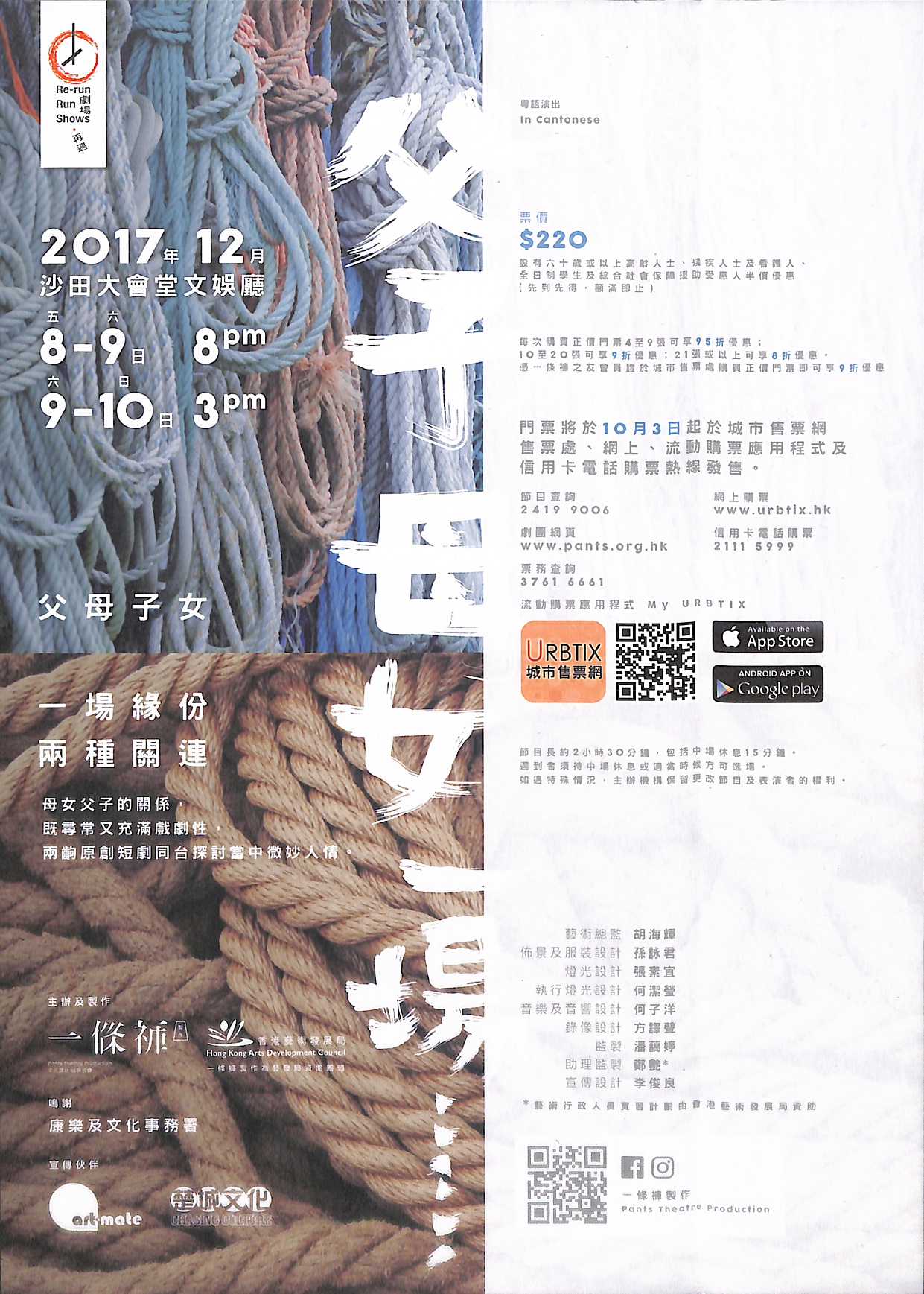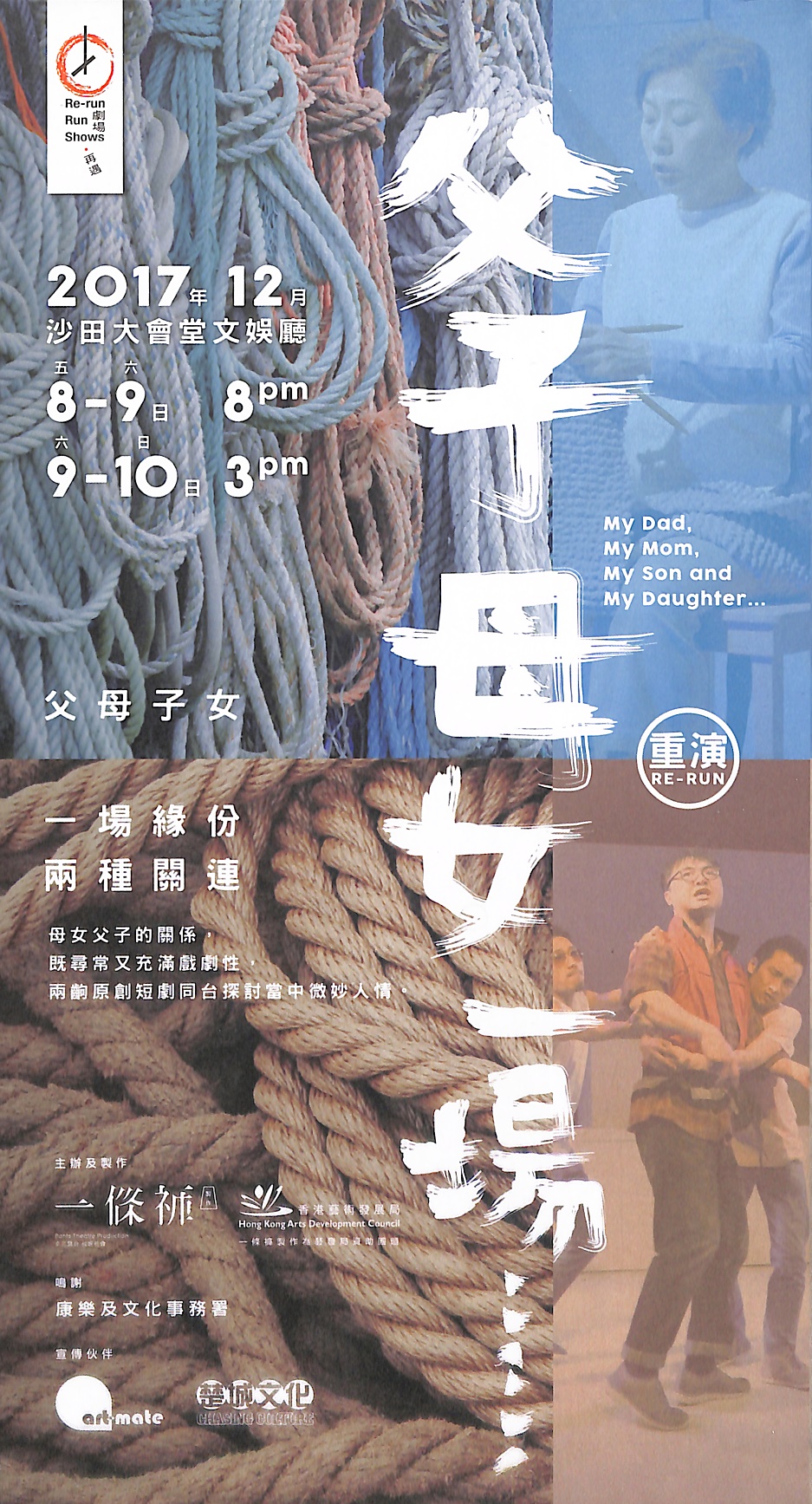 父母子女,一場緣份,兩種關連。母女父子的關係,既尋常又充滿戲劇性。《父子母女一場......》(重演)為兩齣原創短劇,同台探討當中微妙人情。首演於2017年2月上演5場,深得觀眾及劇評人讚賞﹕