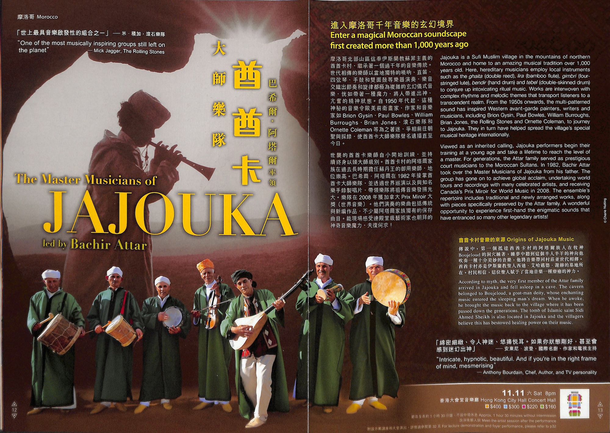 摩洛哥北部山區信奉伊斯蘭教蘇菲主義的酋酋卡村,繼承著一個過千年的音樂傳統。世代相傳的樂師以當地獨特的嗩吶、直笛、四弦琴、手鼓和雙面鼓等樂器演奏,樂音交織出節奏和旋律都極為複雜的玄幻儀式音樂,恍如帶著一種魔力,將人帶進出神、亢奮的精神狀態。自1950 年代起,這種神秘的音樂令歐美前衛畫家、作家和音樂家如Brion Gysin、Paul Bowles、William Burroughs、Brian Jones、滾石樂隊和Ornette Coleman 等為之著迷,爭相前往朝聖與採錄,使酋酋卡大師樂隊聲名遠播。