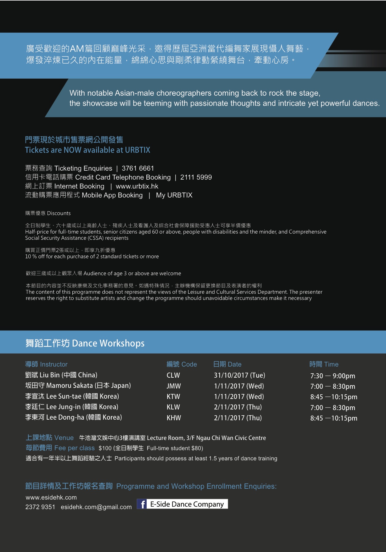 廣受歡迎的AM篇回顧巔峰光采,邀得歷屆亞洲當代編舞家展現懾人舞藝,爆發淬鍊已久的內在能量,綿綿心思與剛柔律動縈繞舞台,牽動心房。
