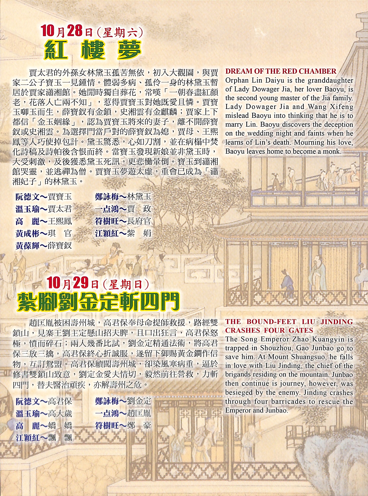賈太君的外孫女林黛玉孤苦無依,初入大觀園,與賈家二公子寶玉一見鍾情。體弱多病、孤伶一身的林黛玉暫居於賈家瀟湘館。她閒時獨自葬花,常嘆「一朝春盡紅顏老,花落人亡兩不知」,惹得賈寶玉對她既愛且憐。賈寶玉啣玉而生,薛寶釵有金鎖,史湘雲有金麒麟;賈家上下都信「金玉姻緣」,認為賈寶玉將來的妻子,離不開薛寶釵或史湘雲。為選擇門當戶對的薛寶釵為媳,賈母、王熙鳳等人巧使掉包計。黛玉驚悉,心如刀割,並在病榻中焚化詩稿及詩帕後含恨而終。當寶玉發現新娘並非黛玉時,大受刺激,及後獲悉黛玉死訊,更悲慟暈倒。寶玉到瀟湘館哭靈,並逃禪為僧。賈寶玉夢遊太虛,重會已成為「瀟湘妃子」的林黛玉。