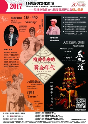「非遺系列文化巡演2017」,以香港這個大都會舞台為平台,邀請來自雲南省滇劇院、兄弟藝盟-周龍工作室、北京的香巴拉劇團和香港藝術團隊等,共同呈獻一連6天的“非遺表演藝術盛宴”。