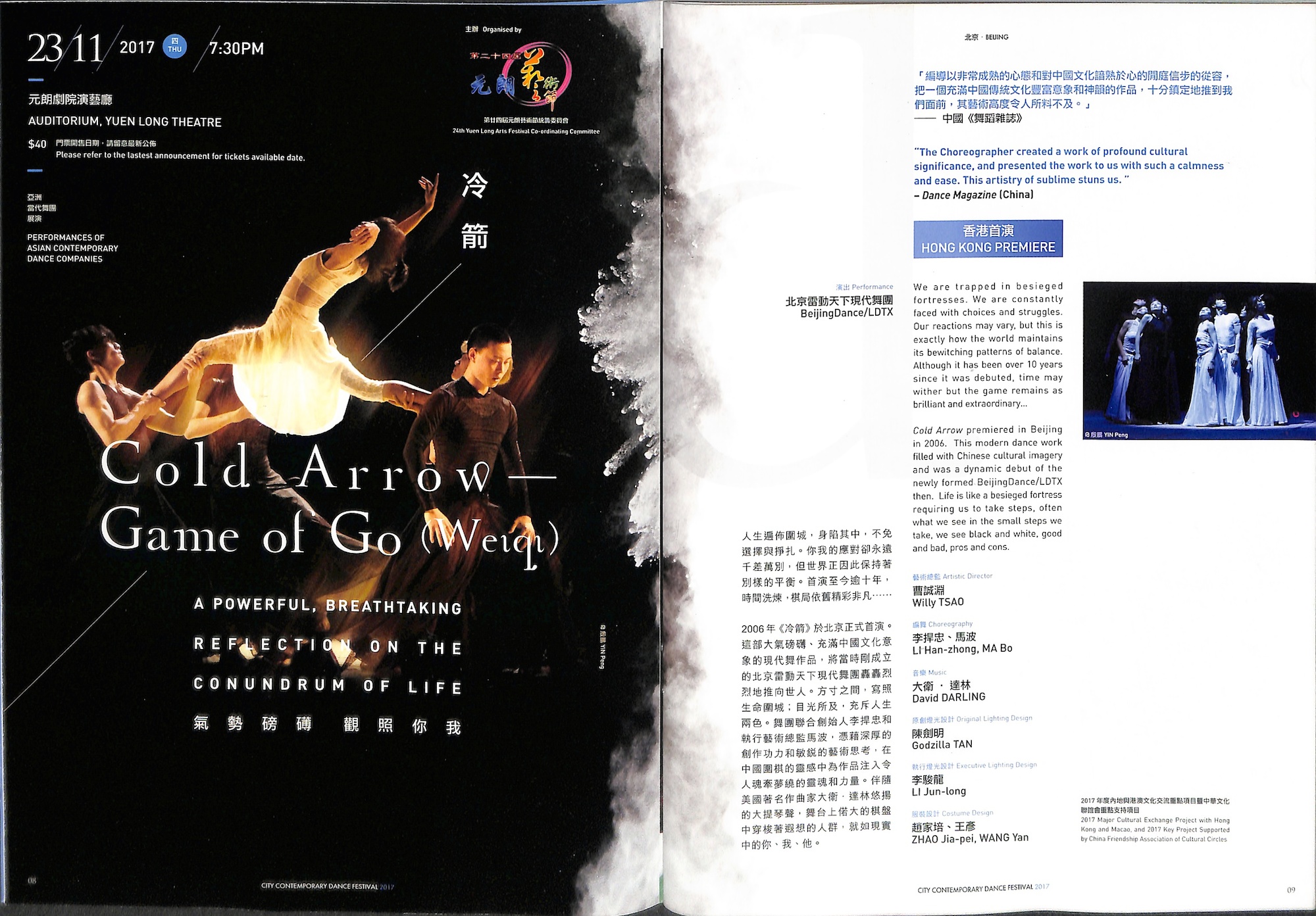 2006年《冷箭》於北京正式首演。這部煥發大氣磅礴、充滿中國文化意象的現代舞作品,將當時剛成立的北京雷動天下現代舞團轟轟烈烈地推向世人。方寸之間,寫照生命圍城;目光所及,充斥人生兩色。舞團聯合創始人李捍忠和執行藝術總監馬波,憑藉深厚的創作功力和敏銳的藝術思考,在中國圍棋的靈感中為作品注入令人魂牽夢繞的靈魂和力量。伴隨美國著名作曲家大衛‧達林悠揚的大提琴聲,舞台上偌大的棋盤中穿梭著遐想的人群,就如同現實中的你、我、他。