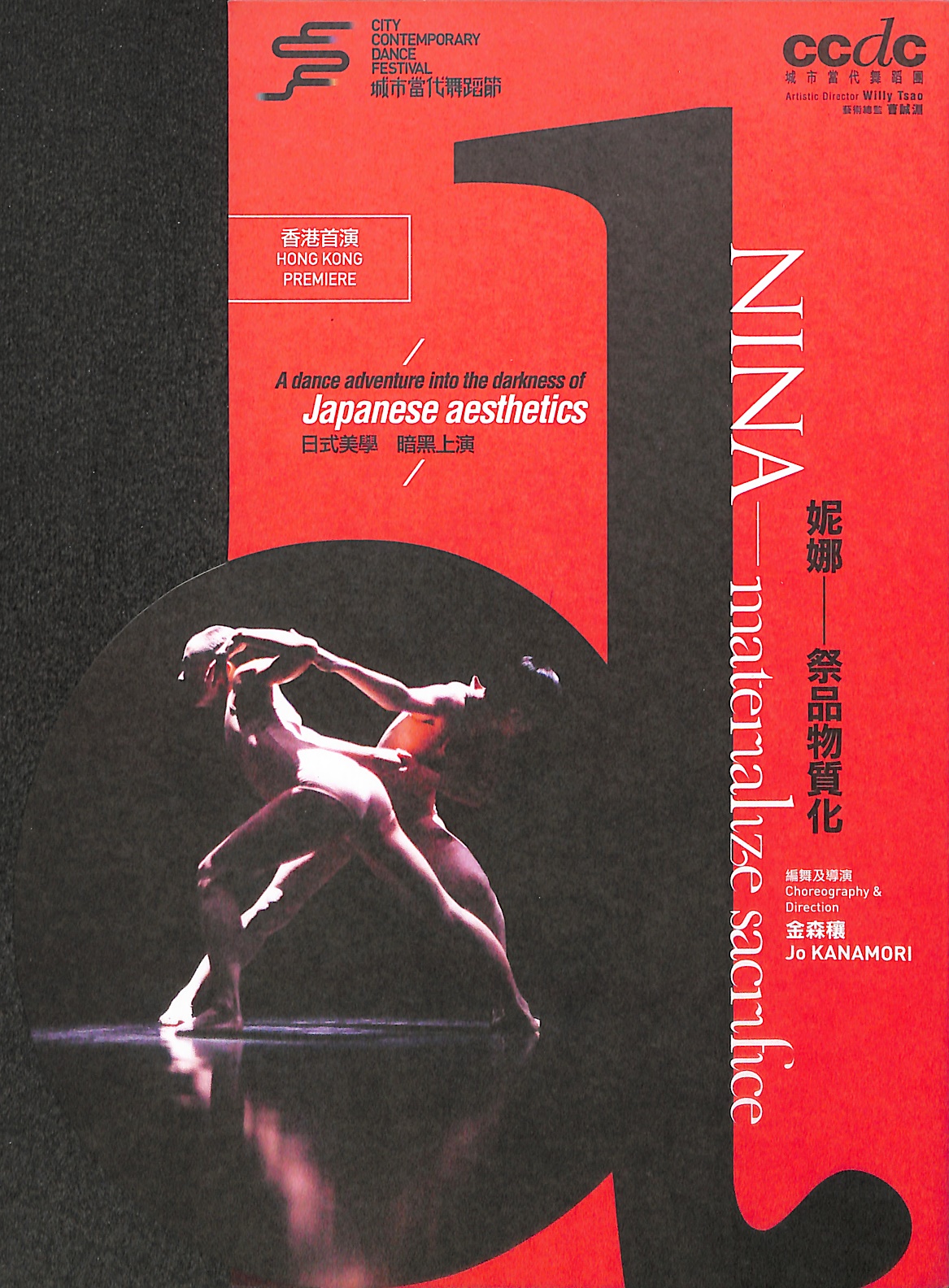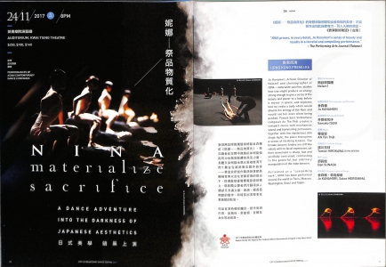 新潟無設限舞團藝術總監金森穰的《妮娜 ── 祭品物質化》,探究舞者在空間中舞動前如何能強而有力地散發肢體的美及力量,身體又如何接地氣以至被推而不倒?舞台在越南裔法國作曲家 ── 尊室安所創作緊湊的重節奏機械音樂以及在若隱若現的燈光下,彷彿散發著驚慄電影般的張力,既彰顯女舞者們冷靜得如人偶卻又充滿力量、速感、極高控制度的動作,同時突出男舞者任意操縱的狂妄。作品首演時備受矚目,曾先後到巴黎、莫斯科、華盛頓、首爾及台北等地巡演。2017年度由日本文化廳支持
