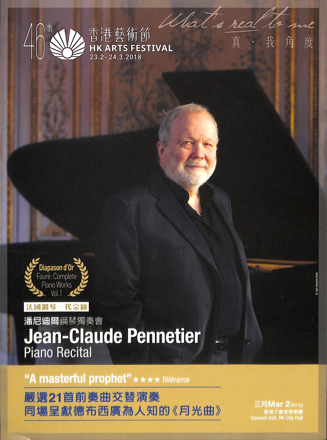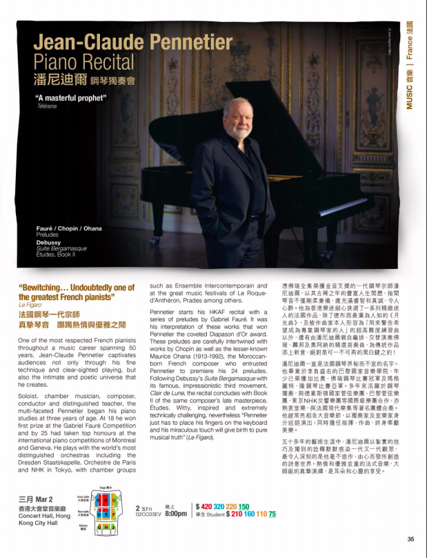 憑佛瑞全集榮獲金音叉獎的一代鋼琴宗師潘尼迪爾,以其古稀之年的豐富人生閱歷,指間琴音不僅剛柔兼備,還充滿睿智和真誠,令人心醉。他為香港樂迷細心挑選了一系列精緻迷人的法國作品,除了德布西最廣為人知的《月光曲》,及被作曲家本人形容為「用來警告希望成為專業鋼琴家的人」的超高難度練習曲以外,還有由潘尼迪爾親自編排,交替演奏佛瑞、蕭邦及奧阿納的精選前奏曲,為傳統作品添上新意,絕對是可一不可再的黑白鍵之約!
