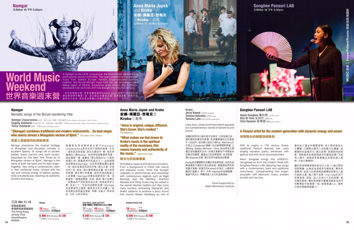 「世界音樂週末營」是香港藝術節的hidden gem,世界不同地域的音樂給樂迷帶來驚喜。這一屆以歐亞女聲為主題,請來自波蘭、韓國和俄羅斯的女歌者,將民族音樂轉化成當代時尚。