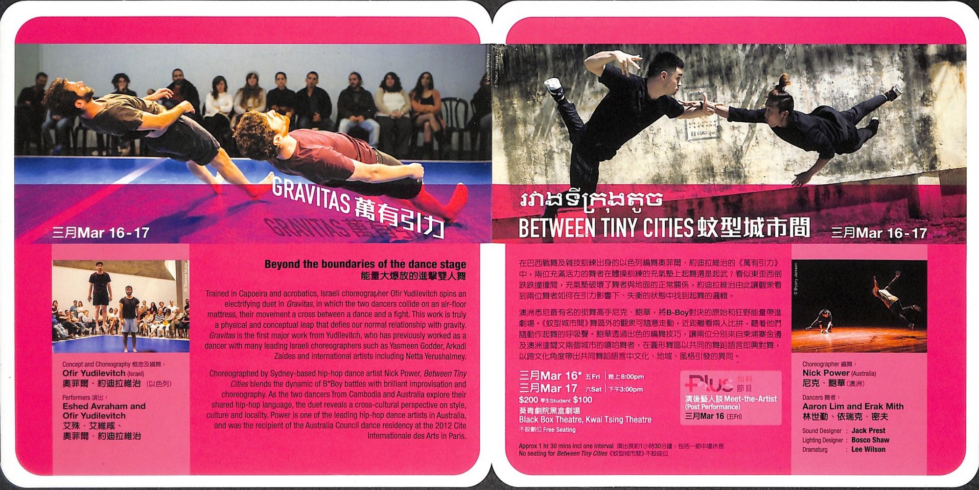 澳洲悉尼最有名的街舞高手尼克‧鮑華,將B-Boy對決的原始和狂野能量帶進劇場。《蚊型城市間》舞區外的觀眾可隨意走動,近距離看兩人比拼,聽着他們隨動作起舞的呼吸聲。鮑華透過出色的編舞技巧,讓兩位分別來自柬埔寨金邊及澳洲達爾文兩個城市的嘻哈舞者,在圓形舞區以共同的舞蹈語言即興對舞,以跨文化角度帶出共同舞蹈語言中文化、地域、風格引發的異同。