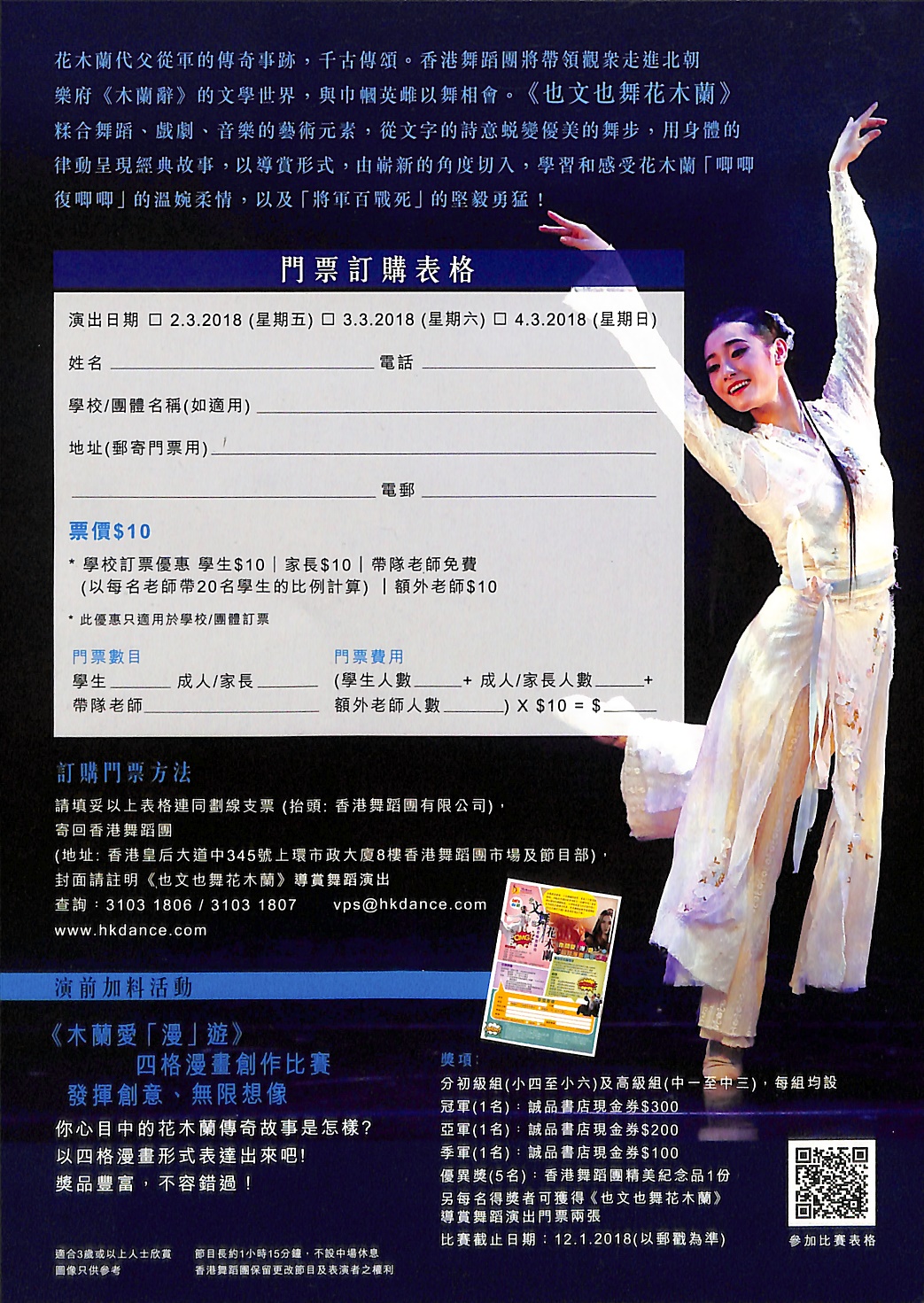 花木蘭代父從軍的傳奇故事,千古傳頌。香港舞蹈團將帶領觀眾走進北朝樂府〈木蘭辭〉的文學世界,與巾幗英雌以舞相會。《也文也舞花木蘭》導賞舞蹈演出糅合舞蹈、戲劇、音樂的藝術元素,從文字的詩意蛻變優美的舞步,用身體的律動呈現經典故事,以導賞形式,由嶄新角度切入,學習和感受花木蘭「唧唧復唧唧」的溫婉柔情,以及「將軍百戰死」的勇敢堅毅!