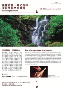 反璞歸真 閑靜舒心忙碌過後,來一趟大自然spa之旅,讓音樂中的芬多精洗去一身煩憂!樂團常任指揮周熙杰將擔任你的嚮導,以新穎及充滿創意的手法,帶你走進大自然森羅萬象的世界越境尋聲。除了風、雷、雨、雪的主題樂曲外,樂團更委約了馬來西亞知名作曲家余家和加入大自然元素聲音創作新曲。為了呈現自然聲音與中樂水乳交融的最高境界,製作團隊將深入雨林和郊區實地錄音,並用科技讓樂團現場直接和大自然之聲對話,帶領觀眾聆聽自然的呼喚,讓靈魂自由放鬆地飛翔!