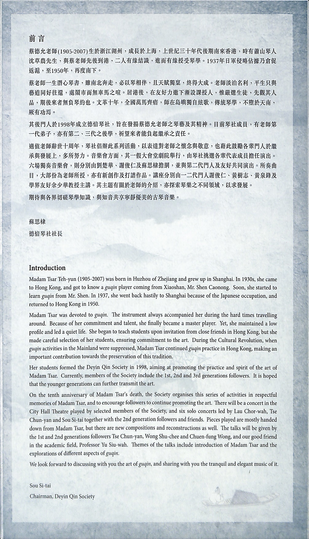 蔡德允老師生於浙江湖州,於上世紀三十年代南來香港,蔡老師一生潛心琴書,雖南北奔走,必以琴相伴,即使在六、七年代期間古琴藝術在國內受到壓制,她仍堅持在香港不斷練習及鑽研琴藝,讓珍貴的傳統琴學得以保存。蔡老師不僅是古琴演奏家,她更樂於收徒傳承琴藝,其後門人於一九九八年成立德愔琴社,旨在發揚她的琴藝及其精神。