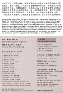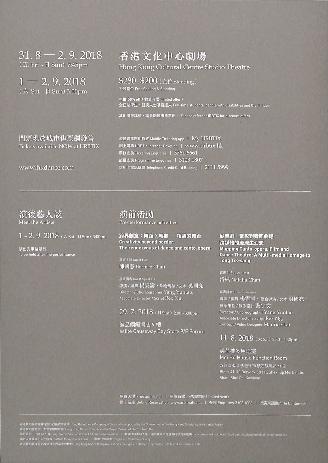 2018年為唐滌生誕辰101年,標誌著新的開始:就由香港舞蹈團聯合桃花源粵劇工作舍,跨越粵劇界限,牽引更多藝術想像。結局迥異的霍小玉同臺並立:認命尋短?自求多福?還是據理力爭?「同是過路同造個夢。」凝視多重宇宙的分身,陷入命定與自決的迷思。