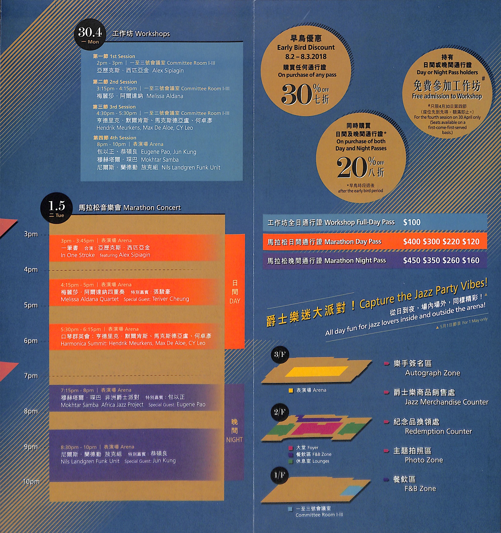 為響應「國際爵士樂日」,康樂及文化事務署請來多位重量級國際及本地爵士音樂家主持一連串工作坊,並舉行本港少見的大型馬拉松式爵士樂音樂會。觀眾可於一天內欣賞不同國家、不同風格、不同演繹方法的爵士樂,包括主流爵士樂(Mainstream Jazz)、當代爵士樂(Contemporary Jazz)、糅合放克(Funk)與非洲節奏風格的爵士樂、獨特的爵士口琴三重奏等。每節音樂會都有外地和本地的樂手同台演出,高手過招,即興演奏,勢必迸發出無限火花!同場還設有多個攤位,參加者更可以於簽名區與樂手作近距離接觸。不論你是熱情不減的資深樂迷,還是剛剛入門的新手聽眾,這項國際盛事都不容錯過!