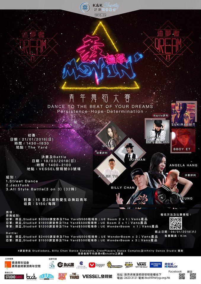 Movin’齊舞初賽日期: 2018年 1 月 21日 (日) 地點: The Yard (九龍新蒲崗五芳街31-33號永顯工業大廈9樓Movin’決賽日日期: 2018年 3 月 18日 (日) 地點: VESSEL發現號03號場 (觀塘海濱道86號)報名費:每隊港幣 150 元正對 象:15 歲至25歲