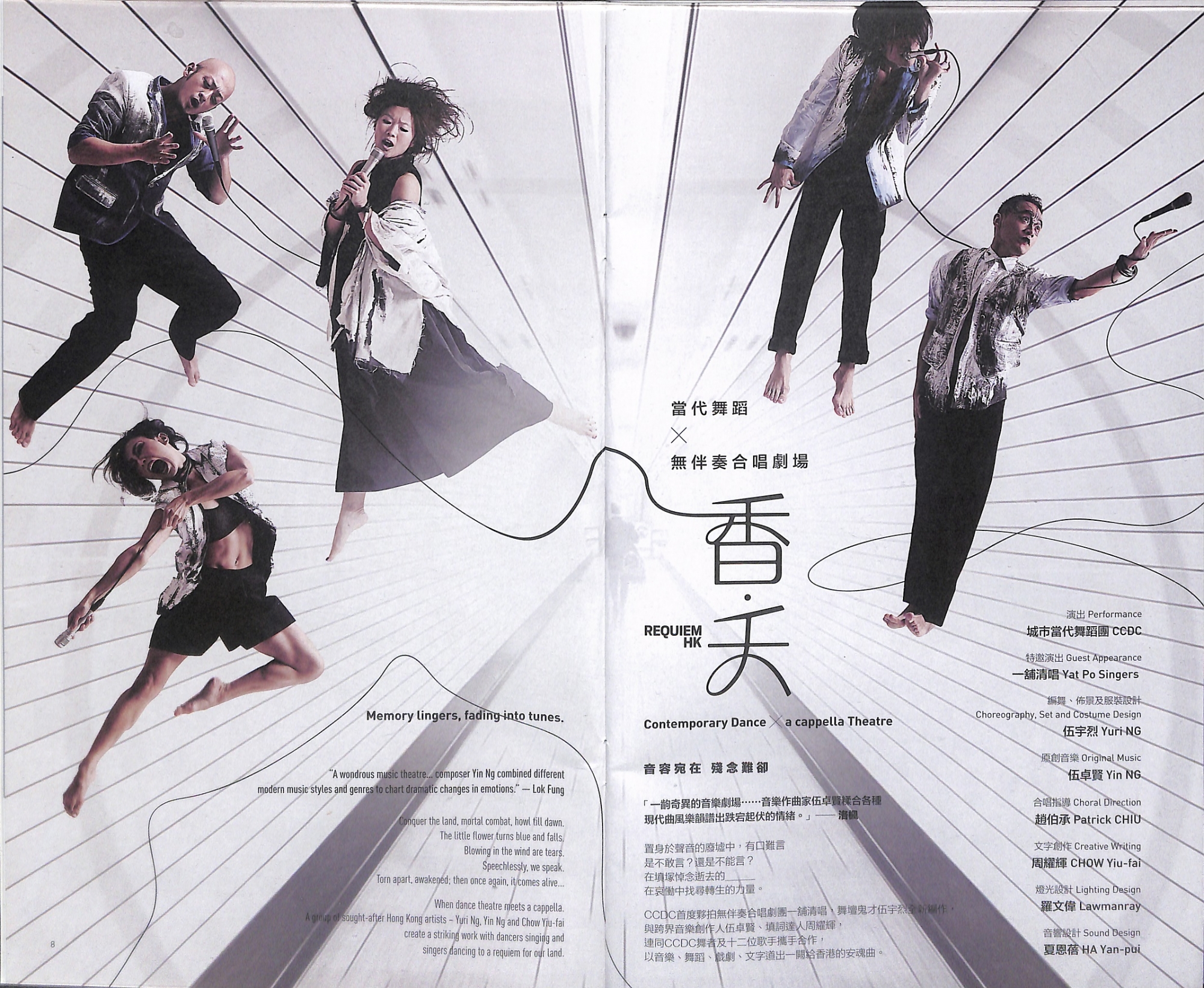 當代舞 x 無伴奏合唱劇場特邀演出:一舖清唱音容宛在 殘念難卻置身於聲音的廢墟中,有口難言是不敢言?還是不能言?在墳塚悼念逝去的______在哀慟中找尋轉生的力量。CCDC首度夥拍無伴奏合唱劇團一舖清唱,舞壇鬼才伍宇烈全新編作,與跨界音樂創作人伍卓賢、填詞達人周耀輝,連同CCDC舞者及一舖清唱十二位歌手攜手合作,以音樂、舞蹈、戲劇、文字道出一闕給香港的安魂曲。