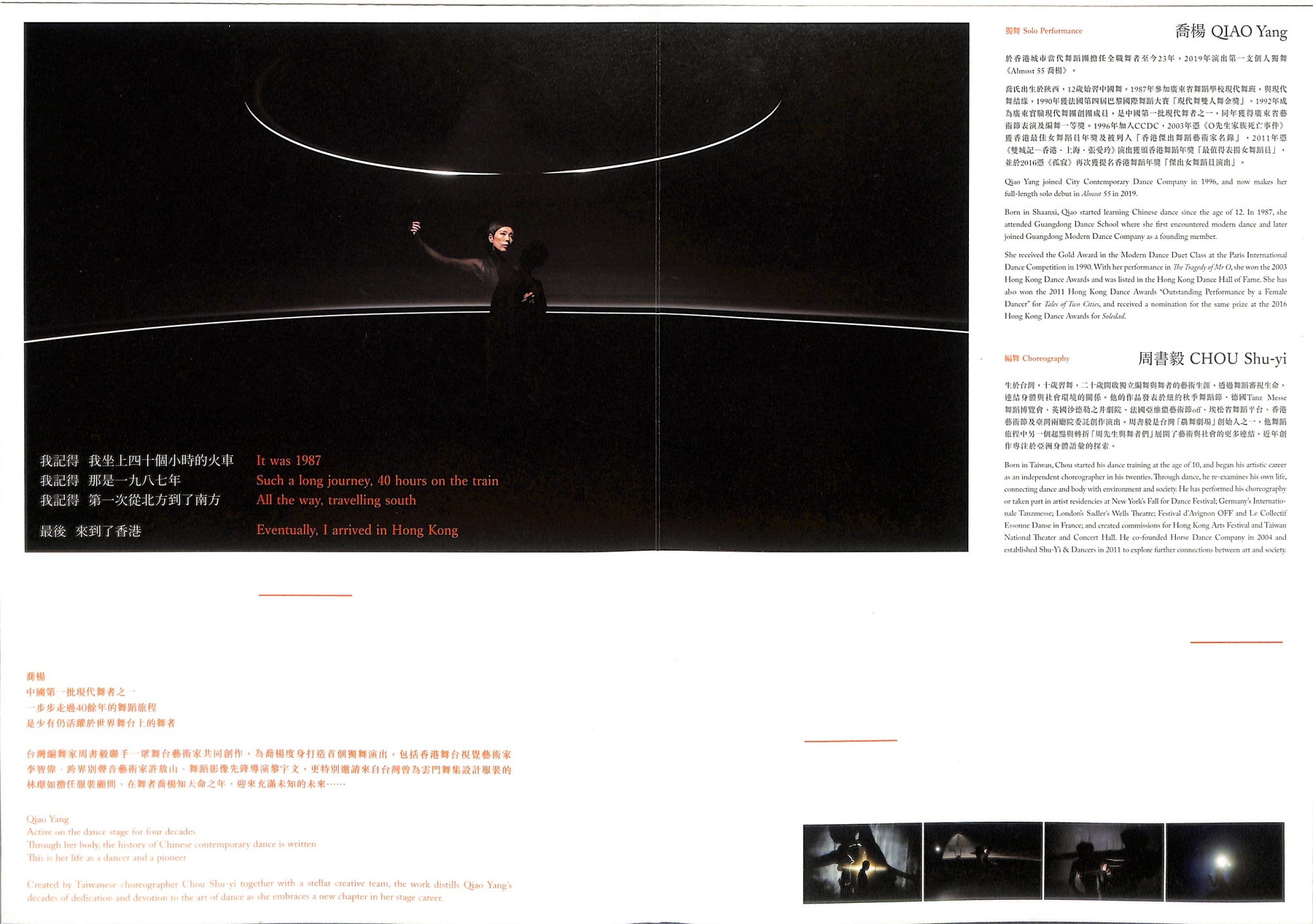我記得 我坐上四十個小時的火車我記得 那是一九八七年我記得 第一次從北方到了南方最後 來到了香港 喬楊中國第一批現代舞者之一一步步走過四十餘年的舞蹈旅程是少有仍活躍於世界舞台上的舞者台灣編舞周書毅聯手一眾舞台藝術家共同創作,為喬楊度身打造首個獨舞演出,包括香港舞台視覺藝術家李智偉、跨界別聲音藝術家許敖山、舞蹈影像先鋒導演黎宇文,更特別邀請來自台灣曾為雲門舞集設計服裝的林璟如擔任服裝顧問,在舞者喬楊知天命之年,迎來充滿未知的未來……