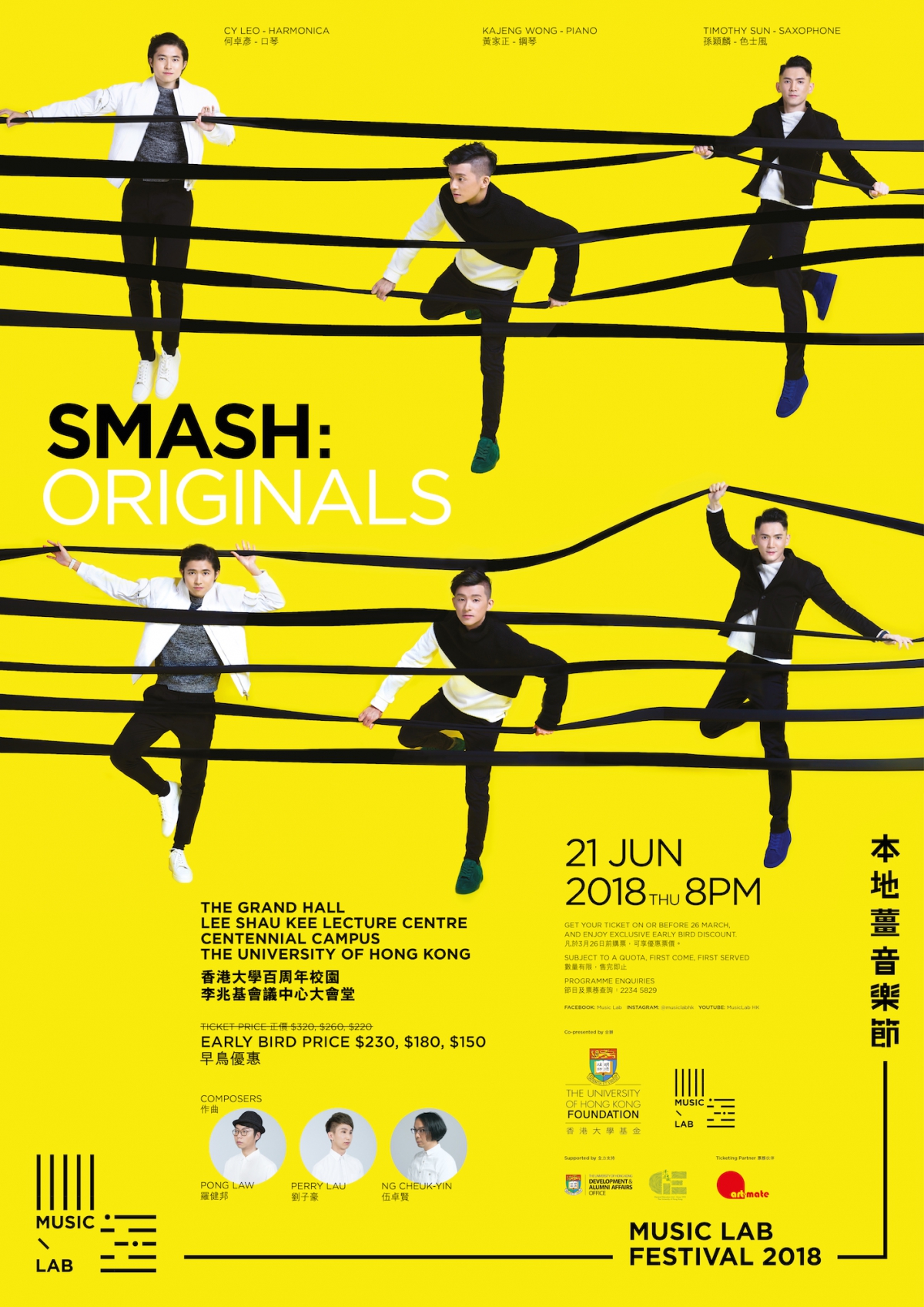 繼上年度廣獲好評,樂迷引頸以待的SMASH今年再下一城,與香港大學及多名本地作曲家合作,帶來變幻莫測的原創聲音。動人出眾的色士風手孫穎麟、活力四射的口琴手何卓彥、技巧多變的鋼琴家黃家正聯手演奏,與樂迷一起盡情地SMASH一場,感受充滿激情和火熱的音樂會!