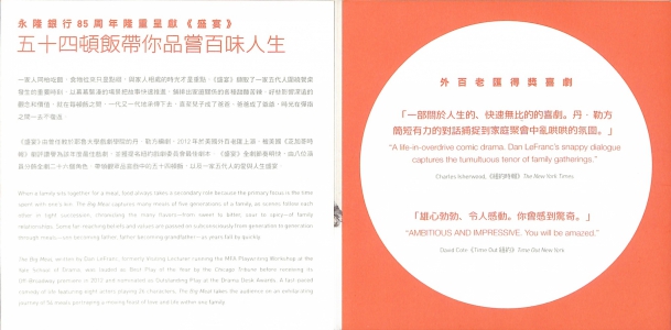 《盛宴》由曾任教於耶魯大學戲劇學院的丹.勒方編劇,2012 年於美國外百老匯上演,被美國《芝加哥時報》劇評讚譽為該年度最佳戲劇,並獲提名紐約戲劇委員會最佳劇本。《盛宴》全劇節奏明快,由八位演員分飾全劇二十六個角色,帶領觀眾品嘗戲中的五十四頓飯,以及一家五代人的愛與人生盛宴。