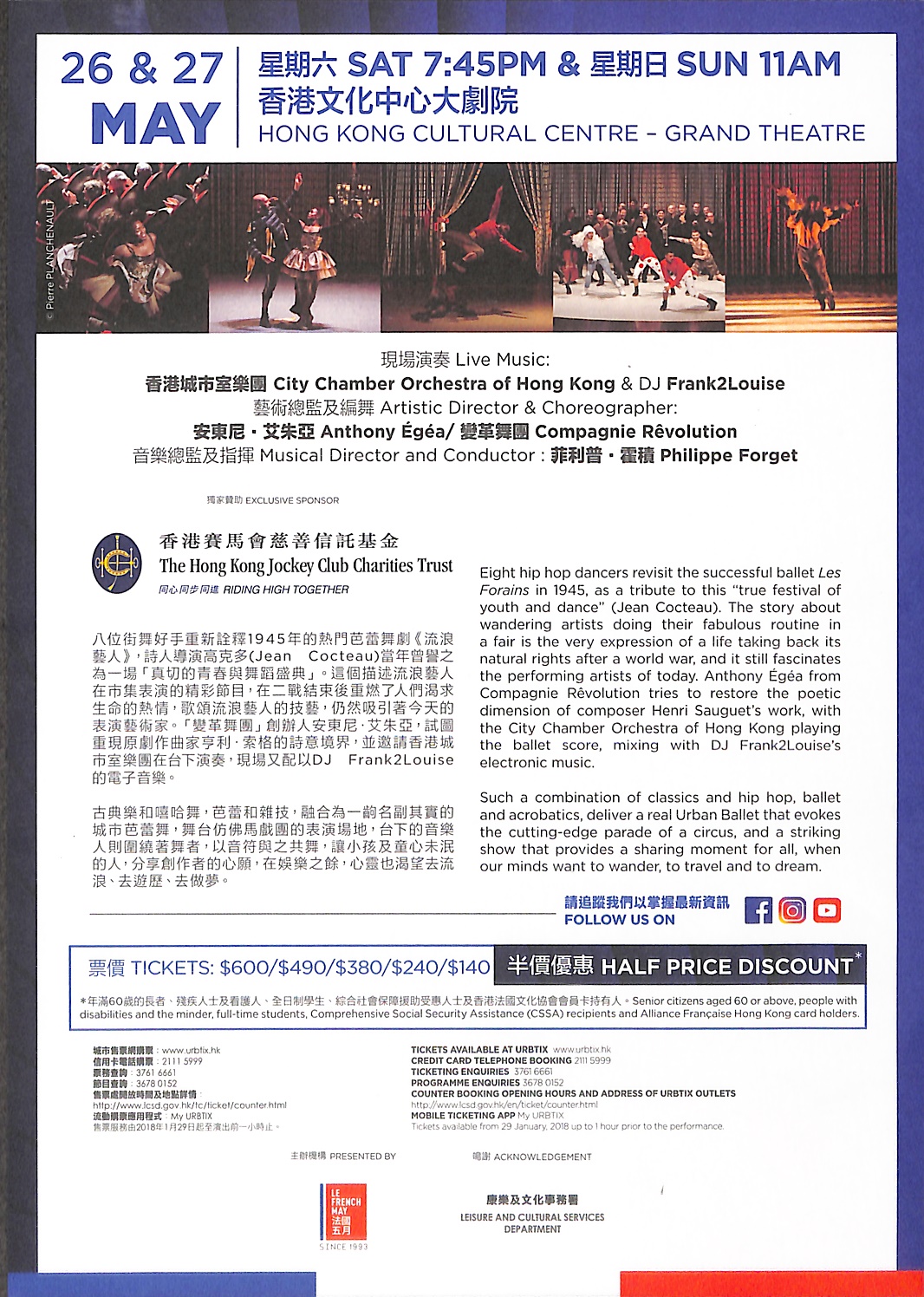 八位街舞好手重新詮釋1945年的熱門芭蕾舞劇《流浪藝人》,詩人導演高克多(Jean Cocteau)當年曾譽之為一場「真切的青春與舞蹈盛典」。這個描述流浪藝人在市集表演的精彩節目,在二戰結束後重燃了人們渴求生命的熱情,歌頌流浪藝人的技藝,仍然吸引著今天的表演藝術家。「變革舞團」創辦人安東尼‧艾朱亞,試圖重現原劇作曲家亨利‧索格的詩意境界,並邀請香港城市室樂團在台下演奏,現場又配以DJ Frank2Louise的電子音樂。