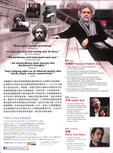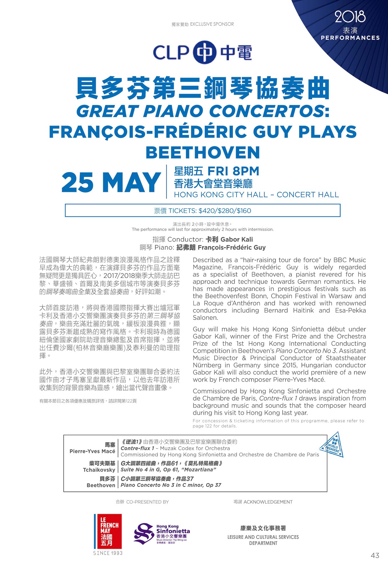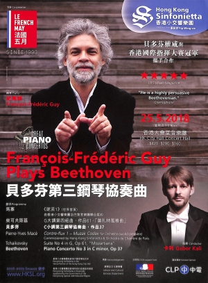 法國鋼琴大師紀弗朗(François-Frédéric Guy)對德奧浪漫時期作品之詮釋早成為典範,在演繹貝多芬的作品方面毫無疑問更是獨具匠心,2017/2018樂季大師走訪巴黎、華盛頓、首爾及南美多個城市等演奏貝多芬的鋼琴奏鳴曲全集及全套協奏曲,好評如潮。大師首度訪港,將與香港國際指揮大賽出爐冠軍卡利及香港小交響樂團演奏貝多芬的第三鋼琴協奏曲,樂曲充滿壯麗的氣魄,緩板浪漫典雅,顯露貝多芬漸趨成熟的寫作風格。卡利現時為德國紐倫堡國家劇院助理音樂總監及首席指揮,並將出任費沙爾(柏林音樂廳樂團)及泰利曼的助理指揮。此外,香港小交響樂團與巴黎室樂團聯合委約法國作曲才子馬塞呈獻最新作品,以他去年訪港所收集到的背景音樂為靈感,繪出當代聲音畫像。