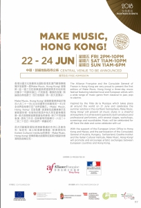 香港法國文化協會與法國駐香港及澳門總領事館攜手呈獻第一屆Make Music, Hong Kong! 音樂節。這一連三日的音樂盛典將邀請眾多本地和歐洲樂手一同參與演出。不同風格、種類的音樂,無論是古典或爵士,流行或電音,將一起大放異彩。