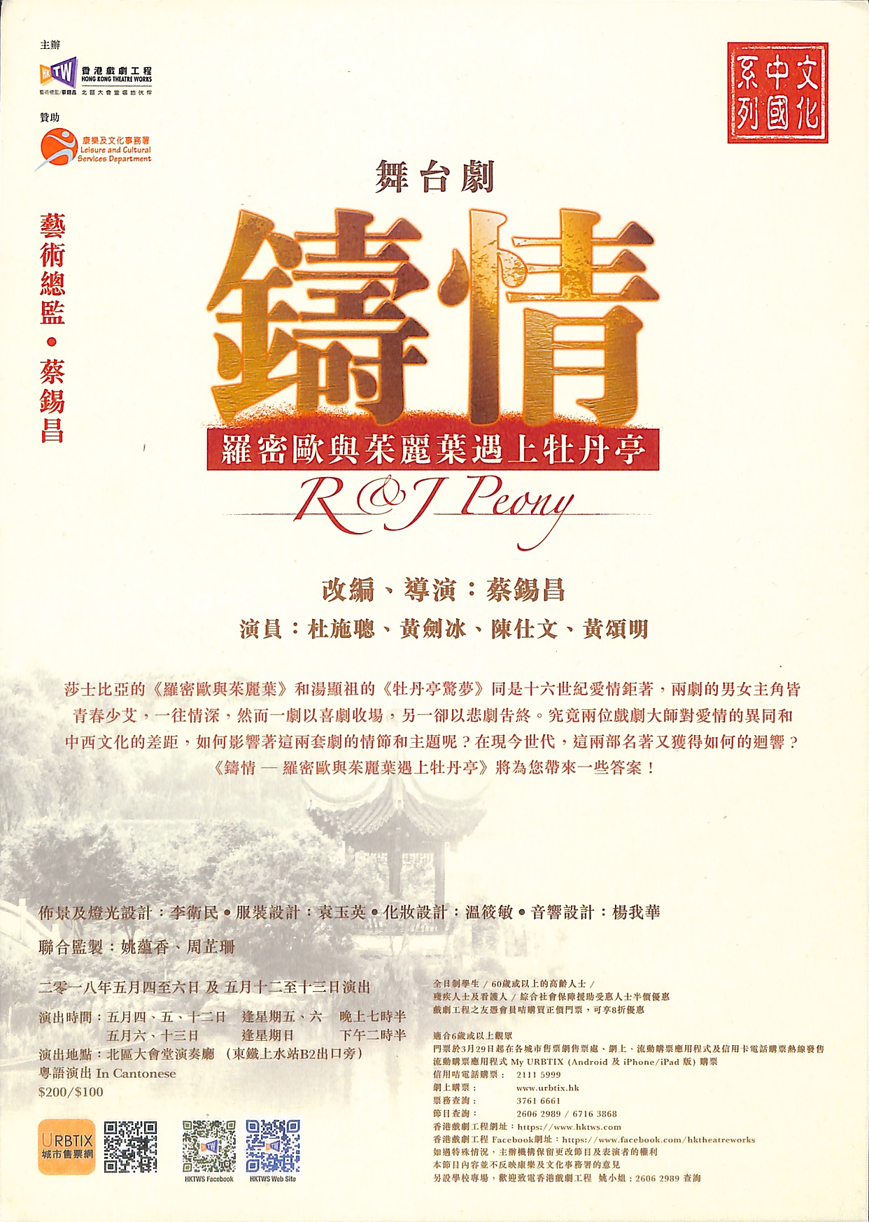 莎士比亞的《羅密歐與茱麗葉》與湯顯祖的《牡丹亭驚夢 》既同是經典名著,又是同期作品。二劇有許多平行的情節和角色,然而結局迴異;一個以悲劇結束,另一齣卻是喜劇收場。《鑄情》是繼《水滸》 及《三國》之後,由蔡錫昌編、導的第三套「文化中國系列」舞台劇,以「新文本」風格,溶合《羅密歐與茱麗葉》與《牡丹亭驚夢 》的 一部「跨界」作品,旨在以介紹兩套名著為基本目的,從而探討中西文化差異,繼而引入現世愛情觀與傳統對話。