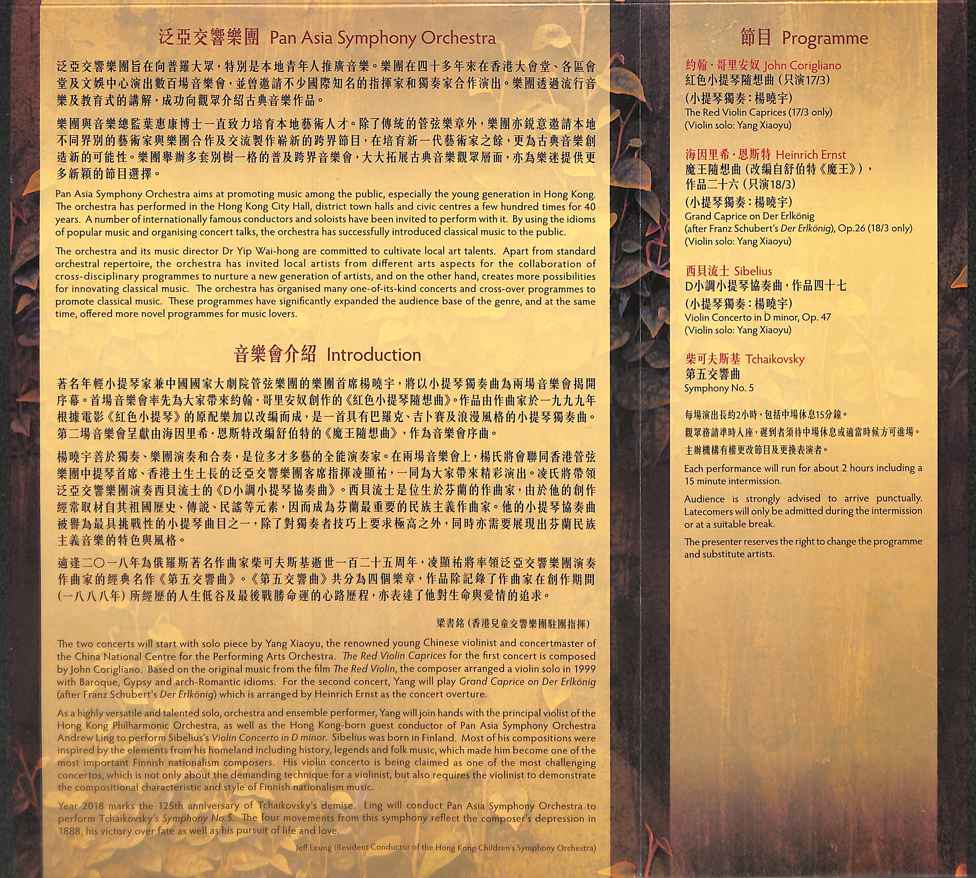 適逢二○一八年為俄羅斯作曲家柴可夫斯基逝世一百二十五周年,凌顯祐將率領泛亞交響樂團演奏作曲家的經典名作《第五交響曲》。《第五交響曲》共分為四個樂章,作品除記錄了作曲家在創作期間(一八八八年)所經歷的人生低谷及最後戰勝命運的心路歷程,亦表達了他對生命與愛情的追求。