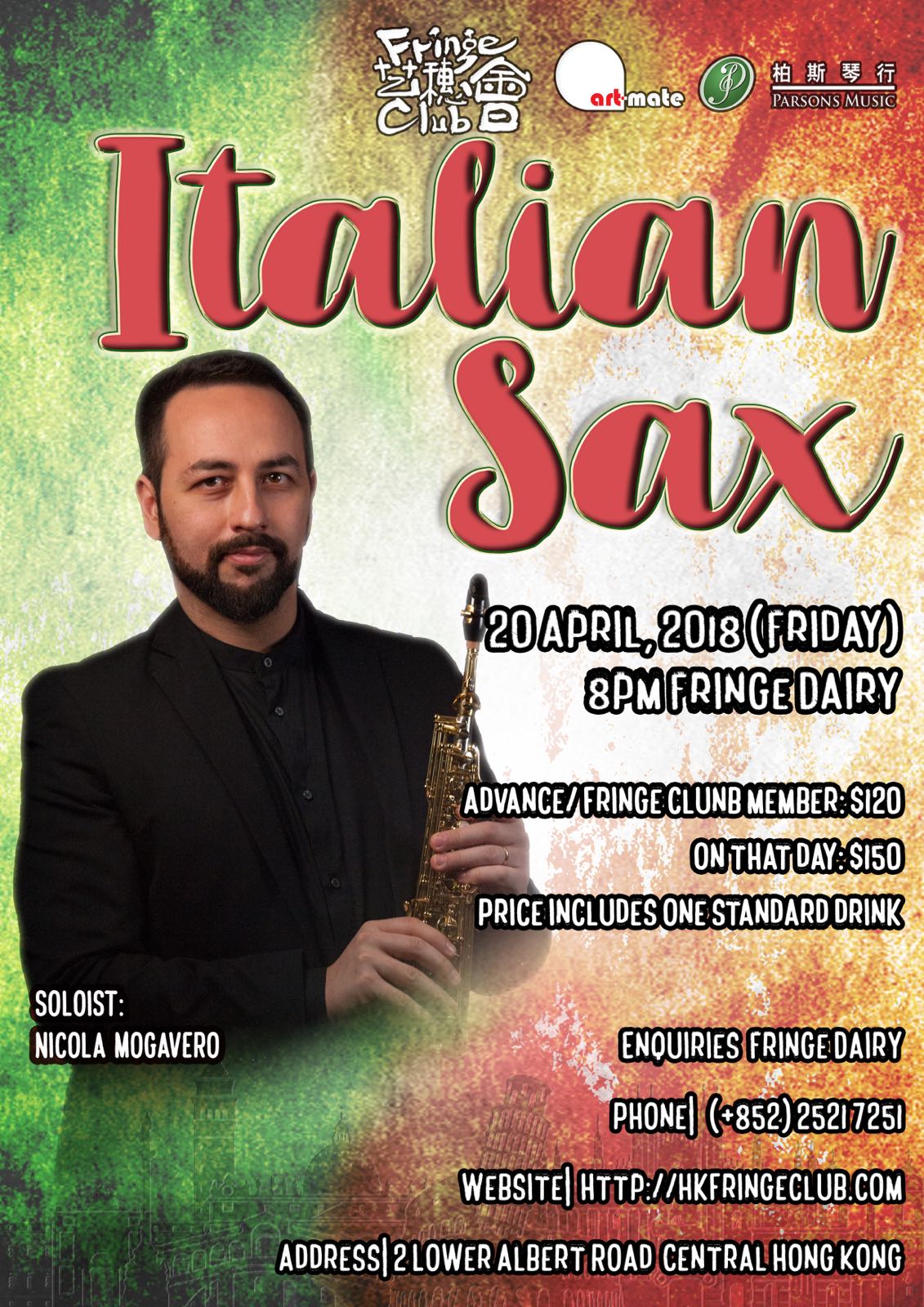 意藉色士風演奏家Nicola Mogavero將於奶庫舉行他在香港的首演音樂會。除了與本地專業色士風演奏家合作,Nicola亦會吹奏特別為他改編的獨奏曲目,當中包括作曲家Molinelli,Morricone及Piazzolla的作品。值得一提的是Nicola更會在這次表演中首次演繹他的新作品。此外,本地色士風演奏家黃德釗博士將參與色士風八重奏的演出。