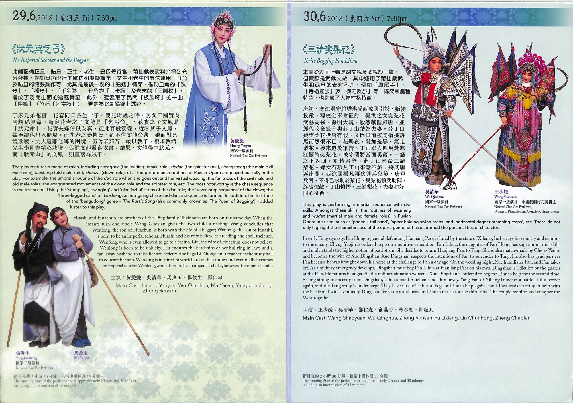 是次演出的劇目均為莆仙戲的傳統劇目,中國戲劇梅花獎得主、國家一級演員王少媛將聯同福建省莆仙戲劇院院長吳清華及副院長黃艷艷,帶領一眾優秀演員演出《狀元與乞丐》、《三請樊梨花》及折子戲專場,當中將展示「抬轎子」、「擺椅」、「掃地裙」、「三腳杖」、「鋤頭功」等特色身段,盡顯莆仙戲的風韻。